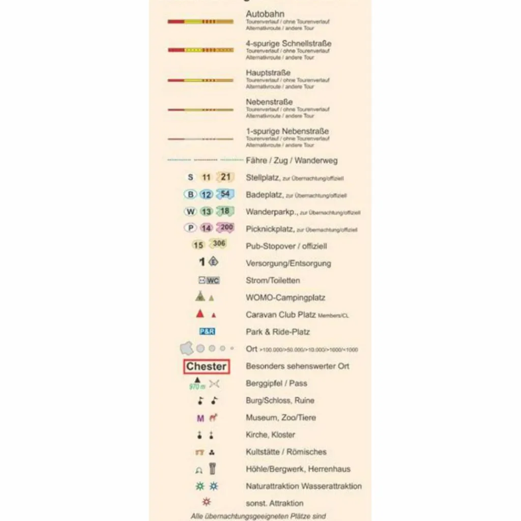 TourenkartenAuf rund 4400 km in 11 Touren zu allen großen Attraktionen und weniger bekannten Orten in Nordengland reisen. Genaue Markierung freier Stell-, Bade-, Picknick-, Wander-, Pub- und Campingplätze incl. Ausstattung. Einzeichnung von Museen, Burgen, Herrenhäusern, Kirchen uvm.Natur erleben, wandernWandern zwischen Bergen und Felsen in den Yorkshire Dales, Höhlen erkunden im Peak District oder durch großartige englische Gärten spazieren. Nationalparks, Wälder, Seen, Moore und Hügel erforschen. Dabei nach seltenen Vögeln Ausschau halten und die wunderschöne Natur genießen. Kulturschätze, StädteUralte Burgen und herrschaftliche Wohnsitze besichtigen. Dazu moderne Metropolen wie Liverpool und Birningham erkunden und traditionelle Städte wie York und Chester erleben. Und natürlich den Hadrianswall sehen, die nördlichsten römischen Spuren an Englands Grenze zu Schottland:Wasser erleben, badenAn stillen Sandbuchten der englischen Nordseeküste entspannen und kleine, verwinkelte Fischerdörfer erkunden. Die weiten Strandstreifen im Westen kennenlernen und durch quirlige Badeorte streifen. Bootsfahrten auf den Seen des Lake District unternehmen.WOMO-ServiceWir vermerken über 280 Plätze zum bequemen Übernachten mit Anfahrtsbeschreibung und präzisen GPS-Koordinaten. Wo vorhanden führen wir die jeweiligen Ausstattungen wie z.B. Ver-/Entsorgung/WC etc. auf. Wir geben Hinweise zu Tagesparkplätzen in Städten, zu Sehenwürdigkeiten und Straßenzuständen.