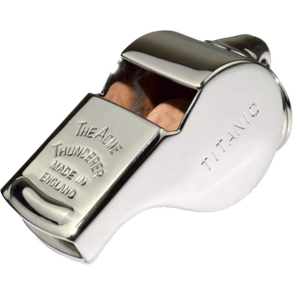 Diese robuste Pfeife ist nicht nur das unveränderte Original, wie sie einst auf der Titanic verwendet wurde, sie wird auch noch mit den gleichen Werkzeugen gefertigt. Hergestellt aus vernickeltem Messing, ist sie extrem robust und funktioniert dank der Trillerkugel aus Kork auch unter widrigen Witterungsbedingungen. Jede Pfeife trägt die Gravur „Titanic“ und wird mit einem „Certificate of Authenticity“ geliefert.