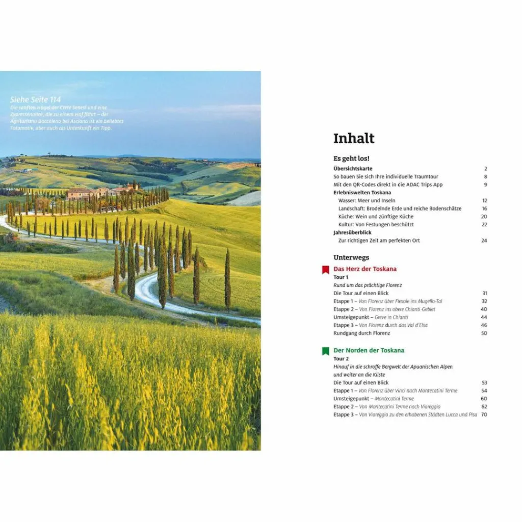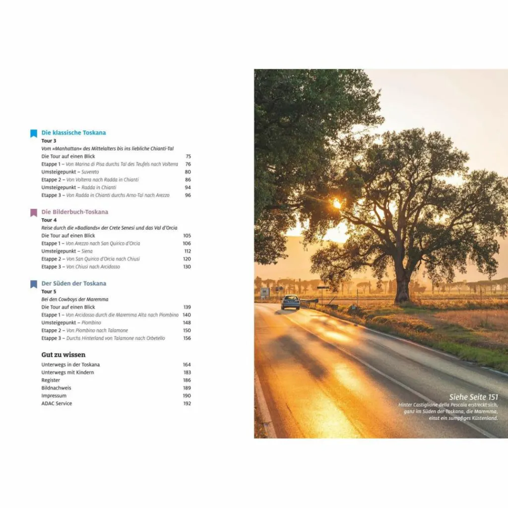 Der erste Band mit Roadtrips, bei dem die ganz besondere Strecke im Mittelpunkt steht – und die schönsten Erlebnisse am Straßenrand: Die schönsten Traumstraßen in bewährter ADAC Qualität entdecken! Die Toskana in ihrer ganzen Vielfalt erleben: Durch Zypressenalleen und Weinberge oder lieber auf Traumstraßen von Florenz nach Pisa? Ein Roadtrip der kulinarischen Entdeckungen oder eigene Etappen zu den schönsten Stränden und Dörfern?
