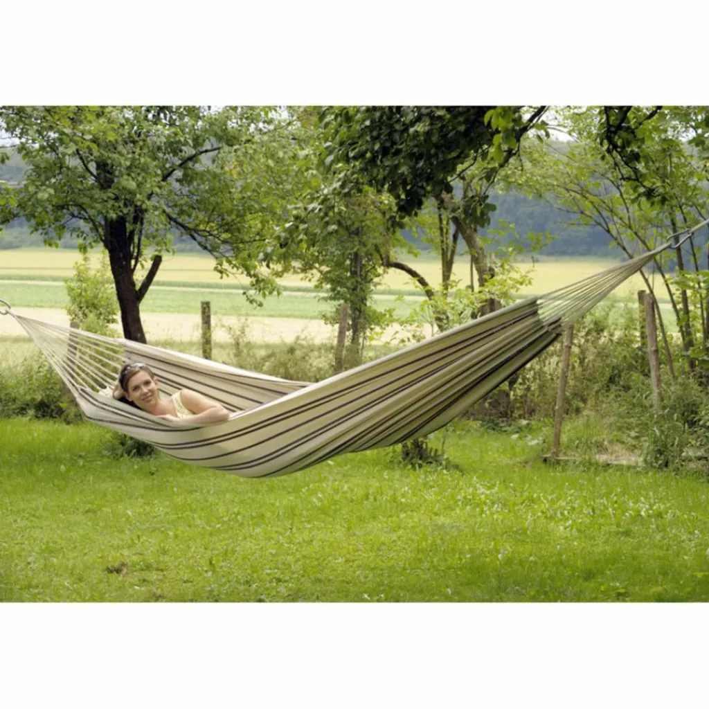Große Hängematte aus kräftiger Recycling-Baumwolle, angenehm breit zum gemütlichen „Querliegen“, wie in Brasilien üblich. So lässt es sich in der Barbados richtig lange aushalten.