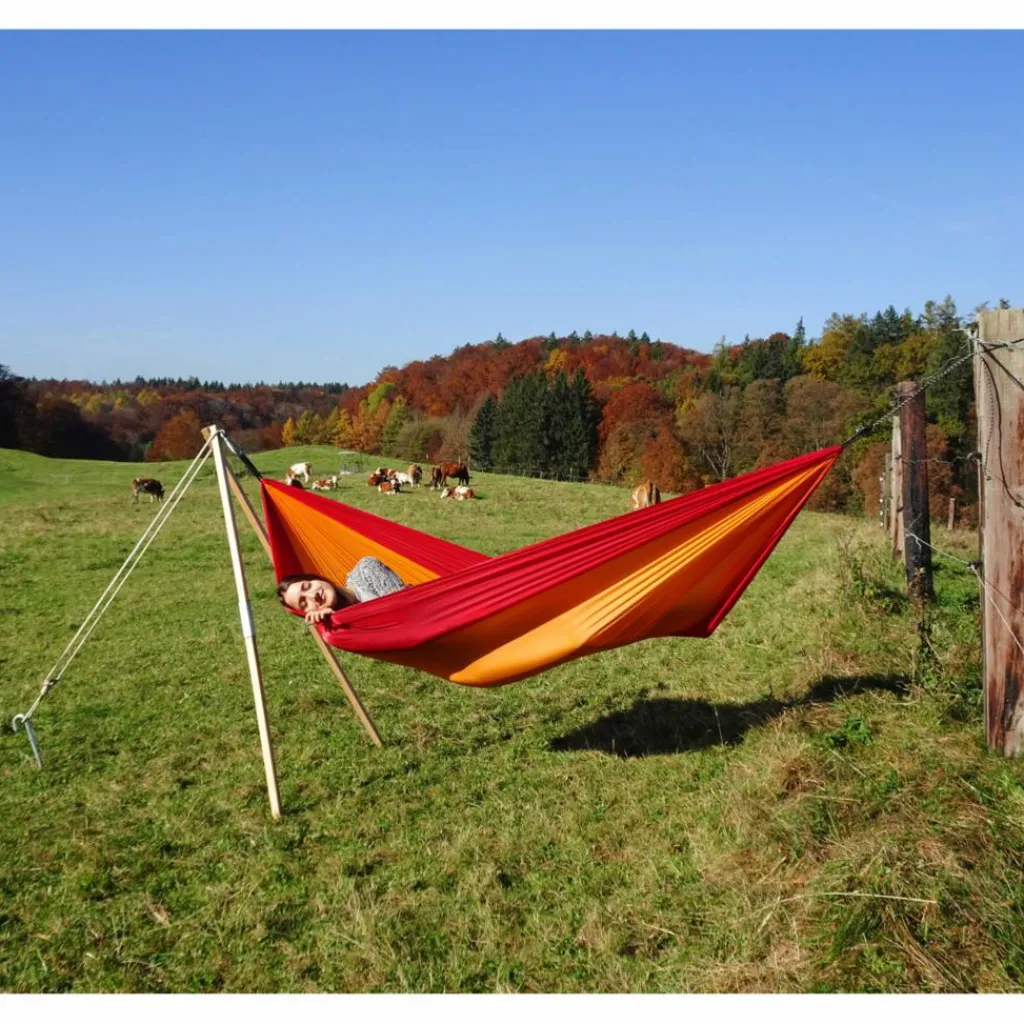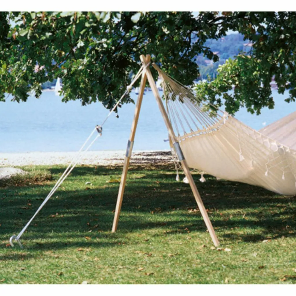 Ein Aufhängepunkt für deine Hängematte lässt sich meist finden. Beim zweiten wird es schon schwieriger. Da hilft das Hängemattengestell Madera: Erdnagel-verankert ersetzt es dir den zweiten Baum.
