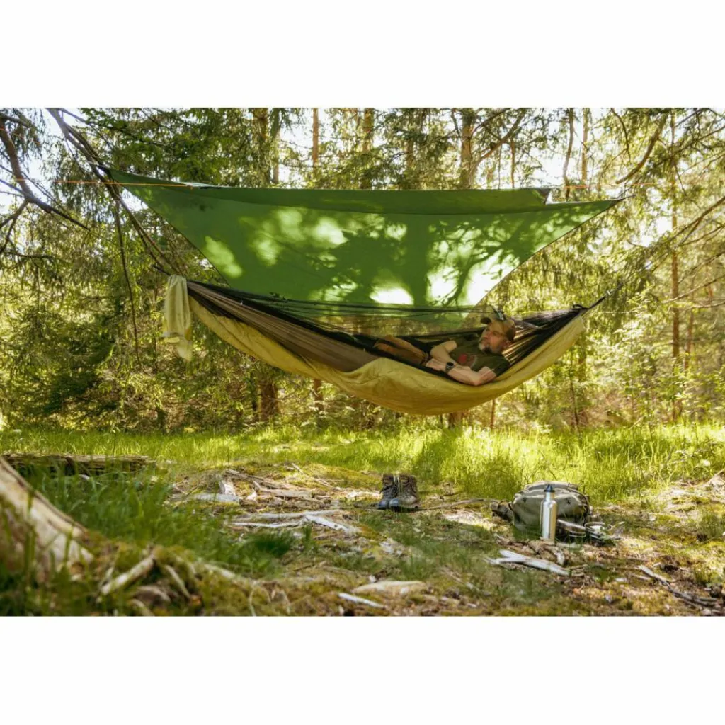 Außerdem ist ein wärmender Underquilt fest mit der Hängematte verbunden, der dir in der Nacht die nötige Wärme spendet. Den Quilt rollst du beim Aufbau gleich mit aus. Er ist so konstruiert, dass auch die rückenschonende diagonale Liegeweise möglich ist („brasilianische“ Liegeposition).