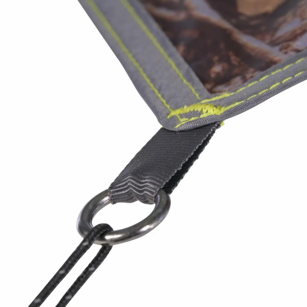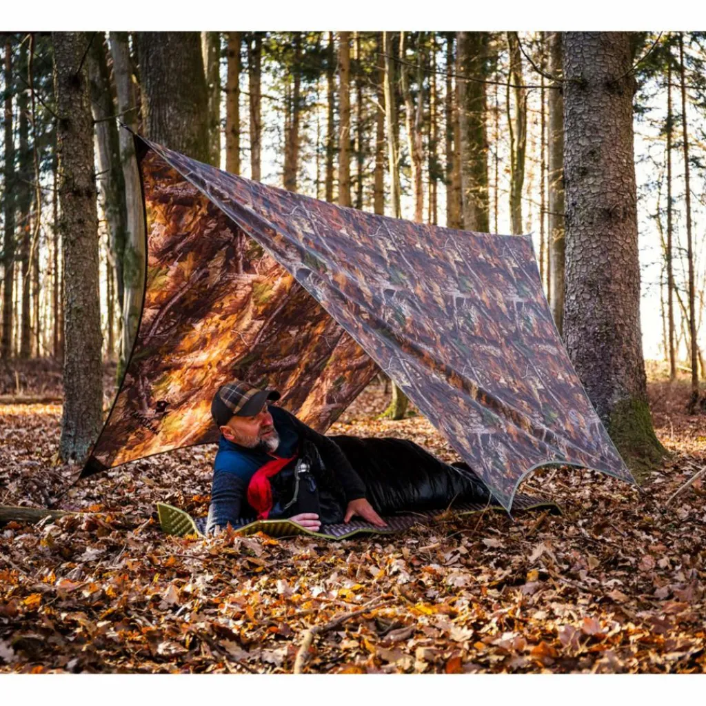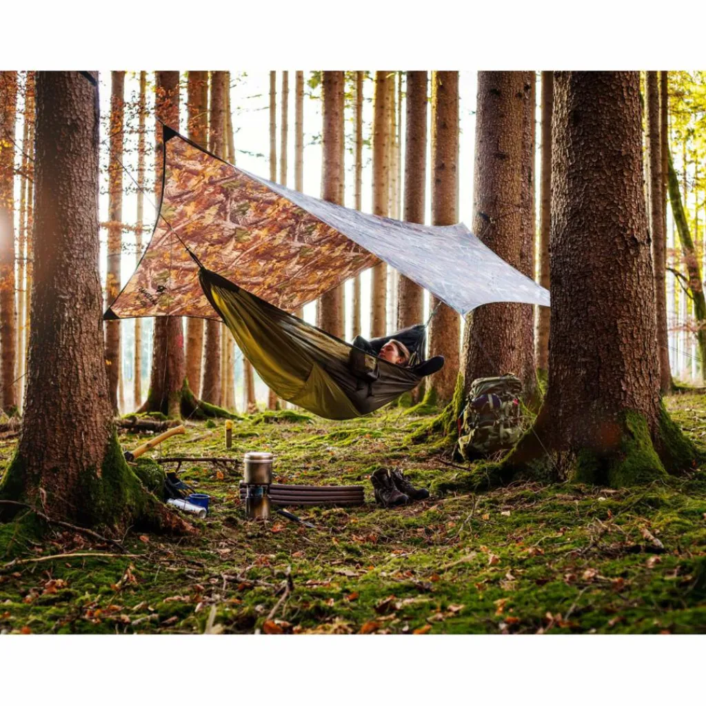 Das Traveller-Tarp in Tarnoptik ist auf Hängemattenmaße abgestimmt und macht deine Hängematte zum wetterfesten Outdoorbett. Es kann auch ohne Hängematte als klassisches Tarp genutzt werden.
