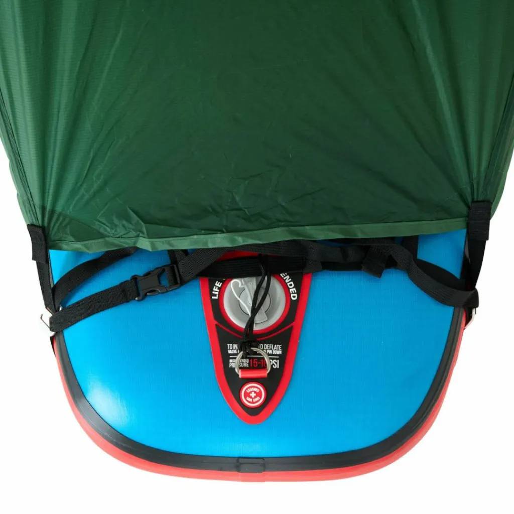 Der Clou ist der Aufbau direkt auf deinem Board (benötigte Mindestlänge: 11,6 ft). Dafür verfügt das Zelt über ein ausgeklügeltes Befestigungssystem. Längenverstellbare Schlaufen fixieren es mit dem Board und seitlich angebrachte aufblasbare Tubes machen das Gesamtsystem kippstabiler. Jede Sidepipe ist 15 cm dick und verbreitern das Board somit um 30 cm.