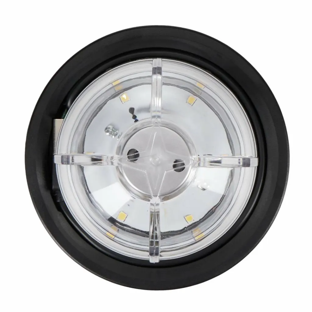 Handgroße Campinglaterne mit stufenloser Dimmfunktion von 30 bis 220 Lumen und einem Lampenschirm aus stoßfestem Stahl. Die Linse besteht aus Polycarbonat und bildet am Fuß eine Standfläche.