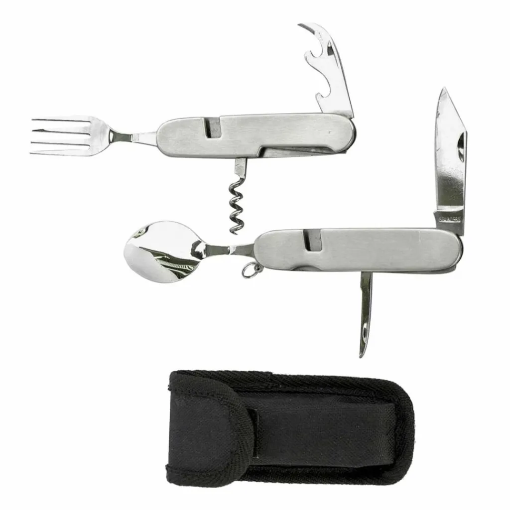 Set aus Messer, Löffel, Gabel, Dosenöffner, Korkenzieher und Ahle. Die beiden Schalen lassen sich entriegeln und so in Messer, Löffel und Ahle auf der einen, den Rest auf der anderen Seite teilen.