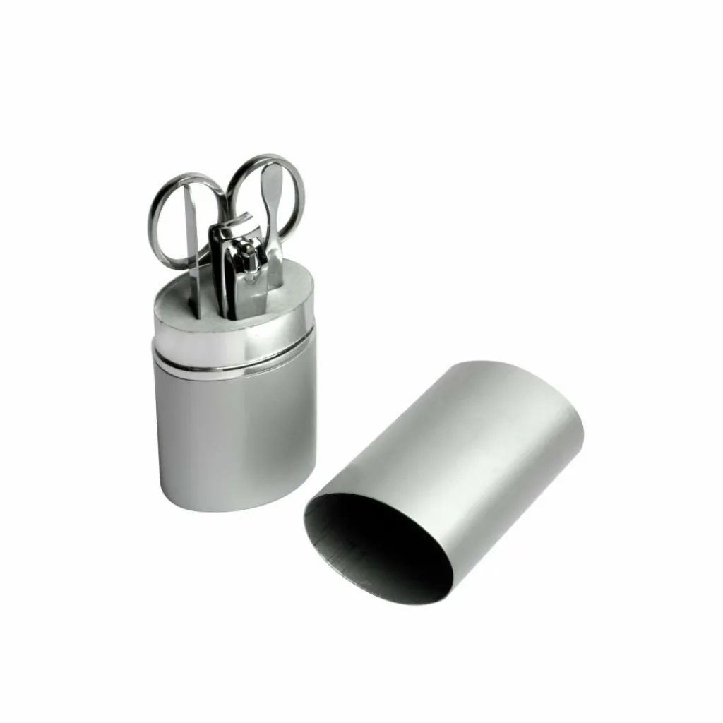 Reise-Maniküre-Set für unterwegs mit Nagelreiniger, Nagelfeile, Nagelklipper und Schere aus Edelstahl. Das Set wird in einer Aluminium-Dose geliefert.