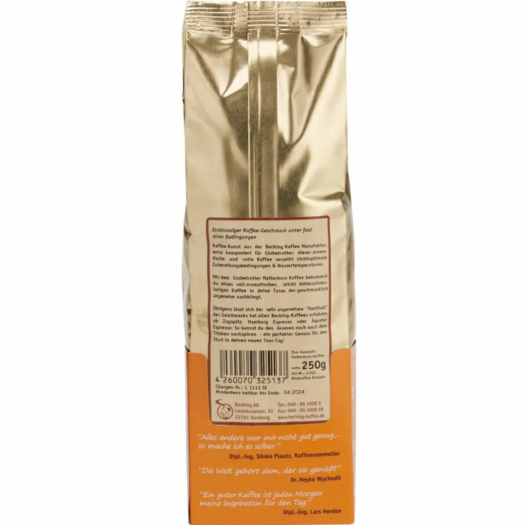 Mit dem Globetrotter Matterhorn Kaffee bekommst du einen voll-aromatischen, leicht bitterschokoladigen Kaffee in deine Tasse, der geschmacklich angenehm nachklingt. Übrigens lässt sich der sehr angenehme „Nachhall“ des Geschmacks bei allen Becking-Kaffees erfahren, ob Zugspitz, Hamburg Espresso oder Äquator Espresso: So kannst du den Aromen noch nach dem Trinken nachspüren – ein perfekter Genuss für den Start in deinen neuen Tour-Tag!