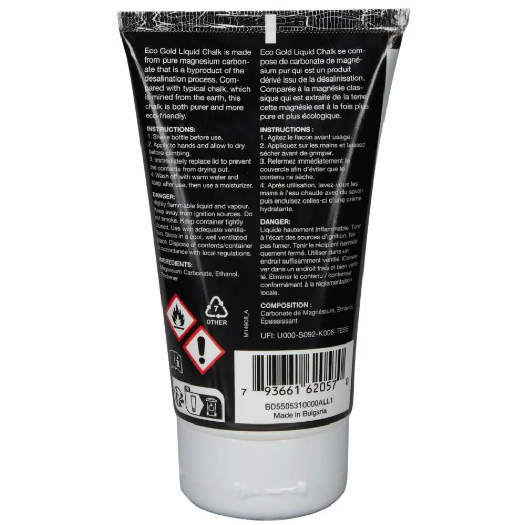 Das Eco Gold Liquid Chalk enthält reines Magnesiumcarbonat, das als Nebenprodukt bei der Entsalzung von Meerwasser anfällt. Die besonders feine, staubfreie Textur des flüssigen Chalks sorgt für eine anhaltende Wirkung, sodass du während des Klettern gar nicht oder weniger nachchalken musst. Perfekt also fürs Klettern und Bouldern bei warmen Temperaturen oder hoher Luftfeuchtigkeit.