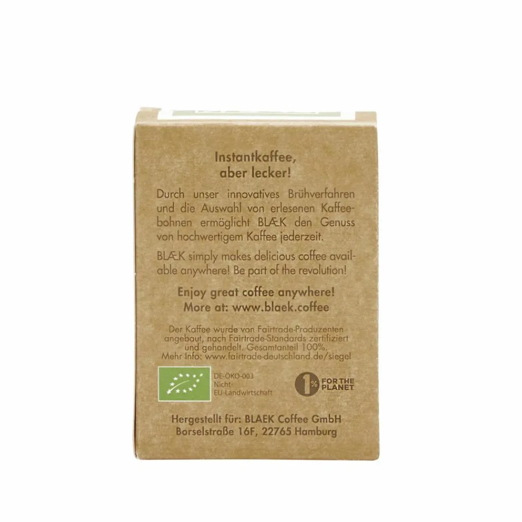 Das kleine Start-up Blaek (ausgesprochen: Bläck) aus Hamburg hat sich zur Aufgabe gemacht, den häufig verpönten Instantkaffe zu revolutionieren. Nach über einem Jahr Entwicklungszeit war der perfekte Schnellkaffee in Barista-Qualität geboren. Das Geheimnis: eine schonende Röstung mit niedriger Temperatur, ein innovatives Brühverfahren mit geringer Wassermenge und eine langsame Vakuum-Gefriertrocknung.