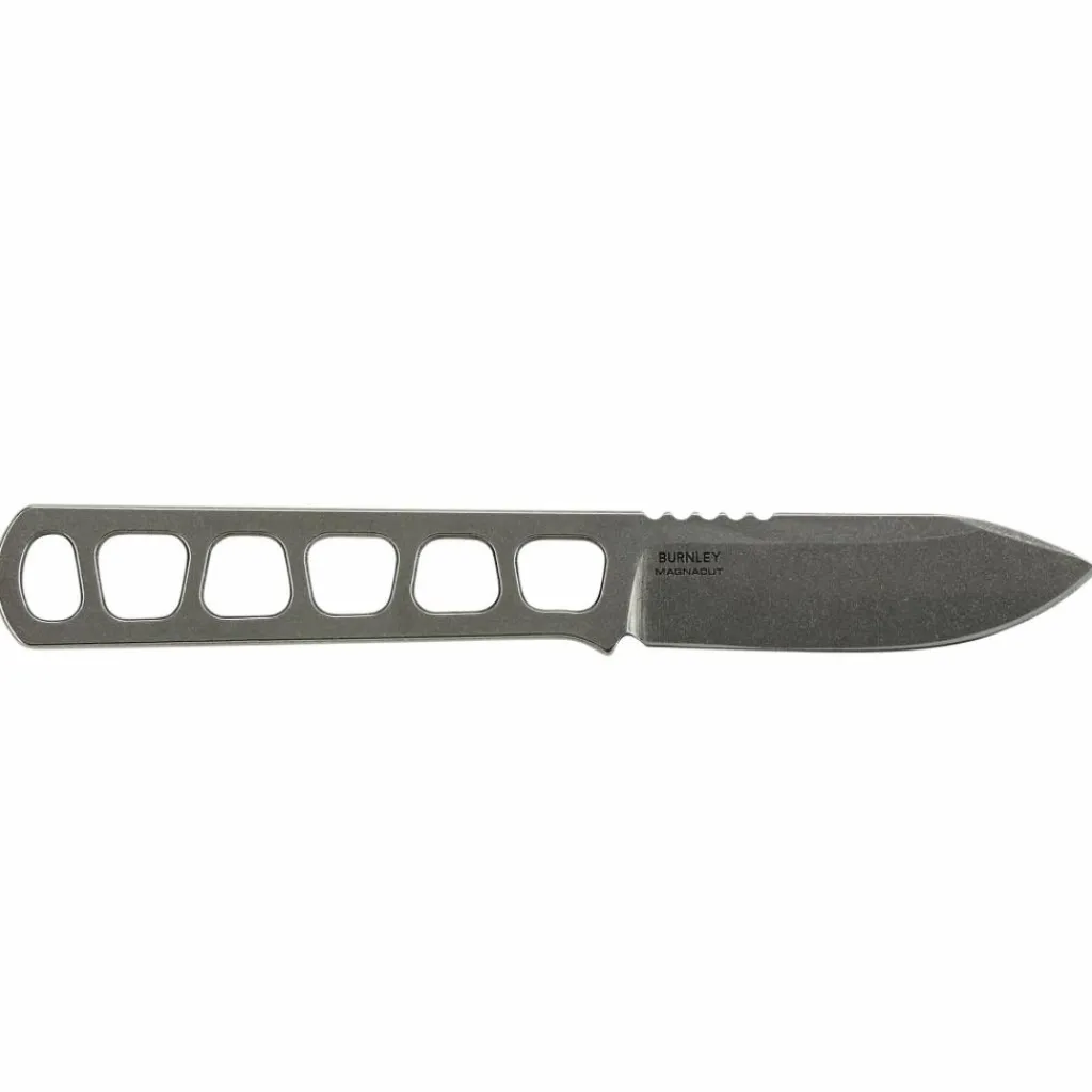 Die Ganzstahlkonstruktion besteht aus pulvermetallurgischem CPM MagnaCut-Stahl, der sich durch Zähigkeit und Rostbeständigkeit auszeichnet. Mit 61-62 HRC ist die Klinge zudem äußerst schnitthaltig. Der Griff ist mit gewichtsreduzierten Aussparungen versehen, wodurch das Messer lediglich 32 g wiegt. Abgerundet wird das Design durch ein mattes Stonewash-Finish.