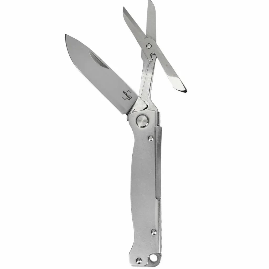 Die Griffschalen dieses schönen Taschenmessers bestehen aus Edelstahl und sind mit einem Stonewash-Finish versehen. Sie ergänzen optisch hervorragend die Klinge und Schere aus poliertem Sandvik-12C27-Stahl. Dieser schwedische Stahl ist als Messerklinge sehr beliebt und zeichnet sich durch hohe Korrosionsbeständigkeit, Schärfe, Schärfbarkeit und Zähigkeit aus. Das Atlas Multi SW eignet sich daher ideal für den täglichen Einsatz.