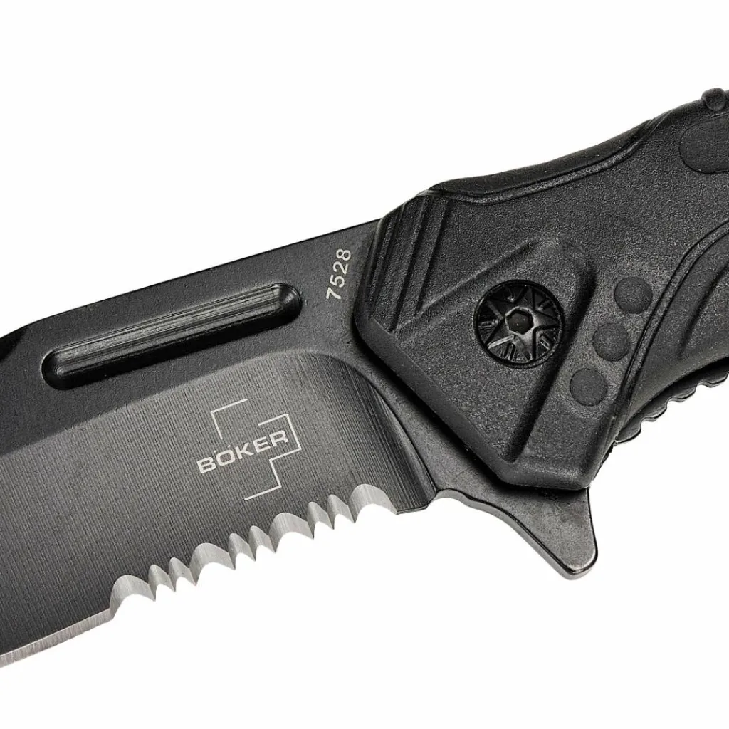 Das taktisch gestaltete Messer kann mithilfe des Flippers einhändig geöffnet werden und verriegelt automatisch dank eines Linerlocks. Der Griff ist 12,6 cm lang und eignet sich somit auch für größere Hände. In den Griffschalen aus glasfaserverstärktem Kunststoff (GFK) ist eine Schicht TPR-Gummi eingearbeitet, um sicherzustellen, dass das Messer auch mit feuchten Händen oder bei Nässe fest in der Hand liegt. Am Ende des Griffs ist ein Dorn eingeschraubt, der sich zum Einschlagen von Seitenscheiben eignet. Zudem kann eine Hakenklinge einhändig ausgeklappt werden, die sich zum Zerschneiden des Sicherheitsgurts eignet.
