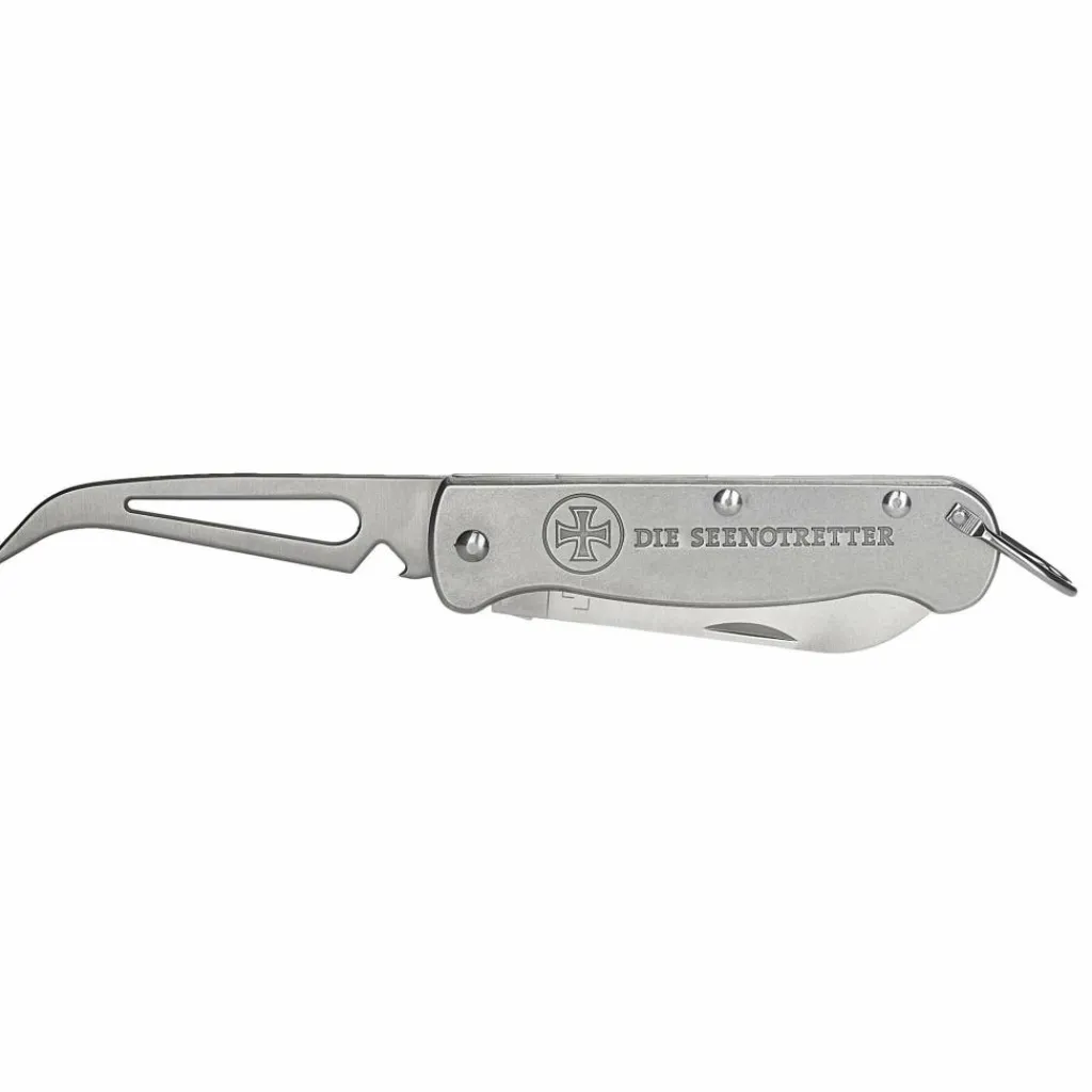 Beide Klingen werden durch einen kräftigen, schmutzunempfindlichen Slipjoint-Verschluss in Arbeitsposition gehalten. Für bedingungslose Haltbarkeit sind die Griffschalen mit kräftigen Domehead-Nieten, statt mit Schrauben versehen. Zudem befindet sich auf ihnen das Logo der Seenotretter mit Hansekreuz.