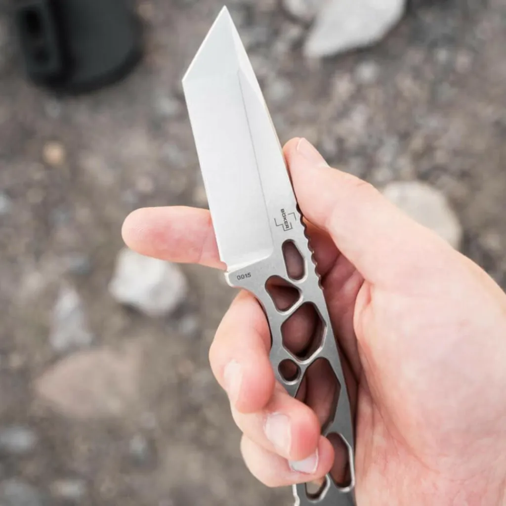 Mit nur 100 g ist das Superlight Tanto ein leichtes Messer mit Ganzstahlkonstruktion. Die Tantoklinge besteht aus zähem, verschleißfestem D2-Stahl mit einer Rockwellhärte von 62.