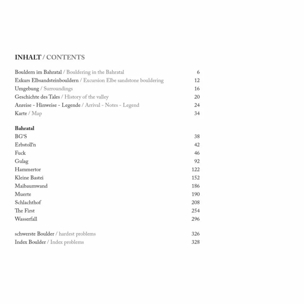 Mit OBouldering Bahratal 2021 ist eine komplett überarbeitete Neuauflage erschienen. Eine Hauptkarte mit Sektorenübersicht sowie Übersichtskarten und Zustiegsbeschreibungen zu jedem Sektor, GPS-Koordinaten für die einzelnen Blöcke und Blockfotos mit eingezeichneten Boulderlinien erleichtern die Orientierung. Im handlichen DIN A5-Querformat sind 336 Seiten gebündelt. Die zweisprachige Ausführung (Deutsch/ Englisch) umfasst auch die Boulderbeschreibungen.