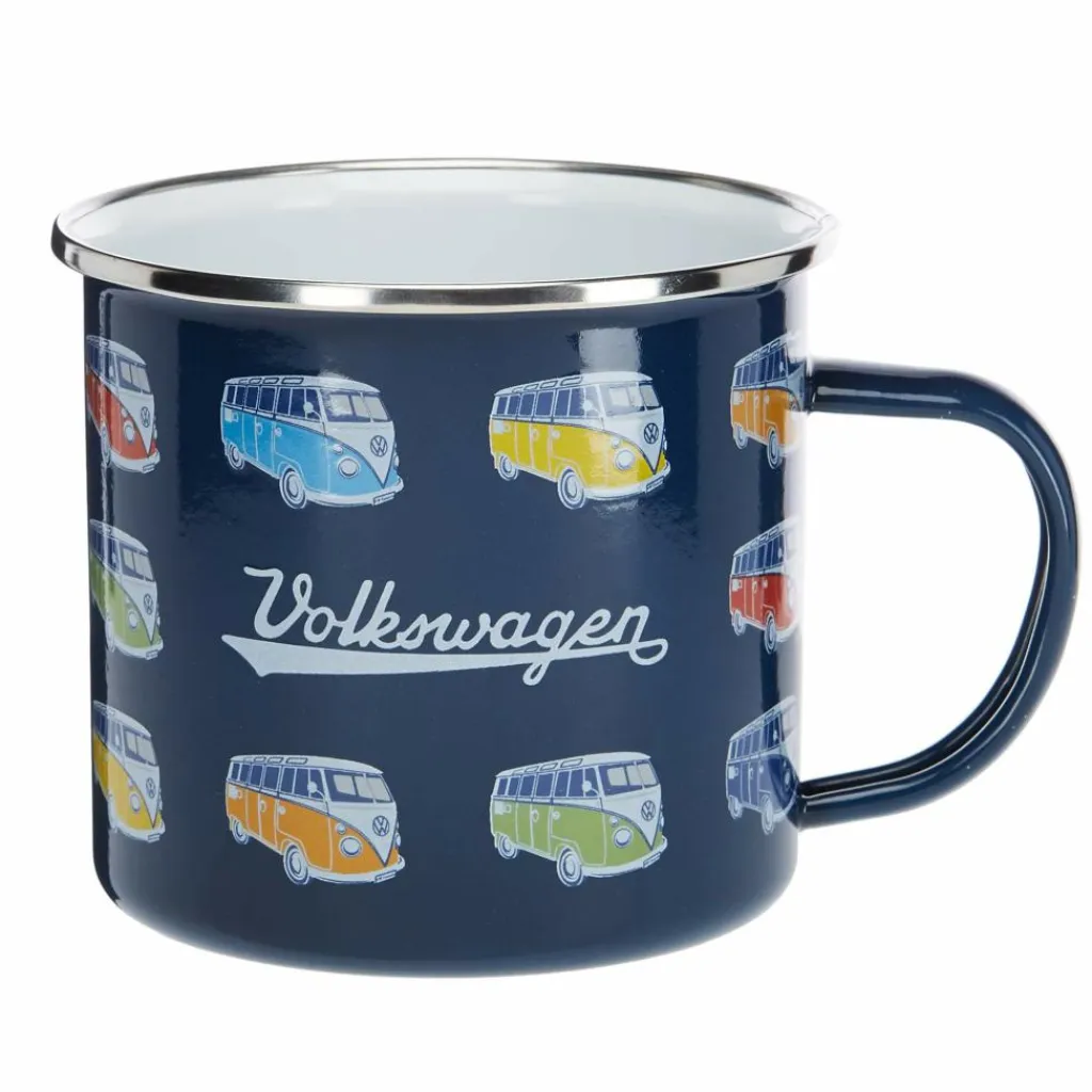 Großer Becher mit 500 ml Volumen. Du kannst den Becher dank der Emaille–Beschichtung leicht reinigen. Bruchsicher ist er ebenfalls. Ein tolles Geschenk für sich selbst oder für alle Bulli-Liebhaber.