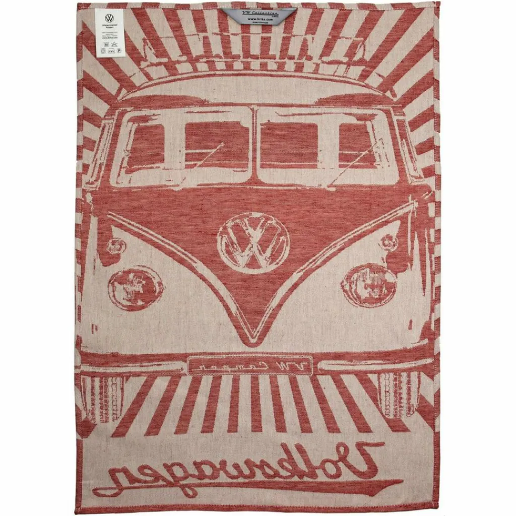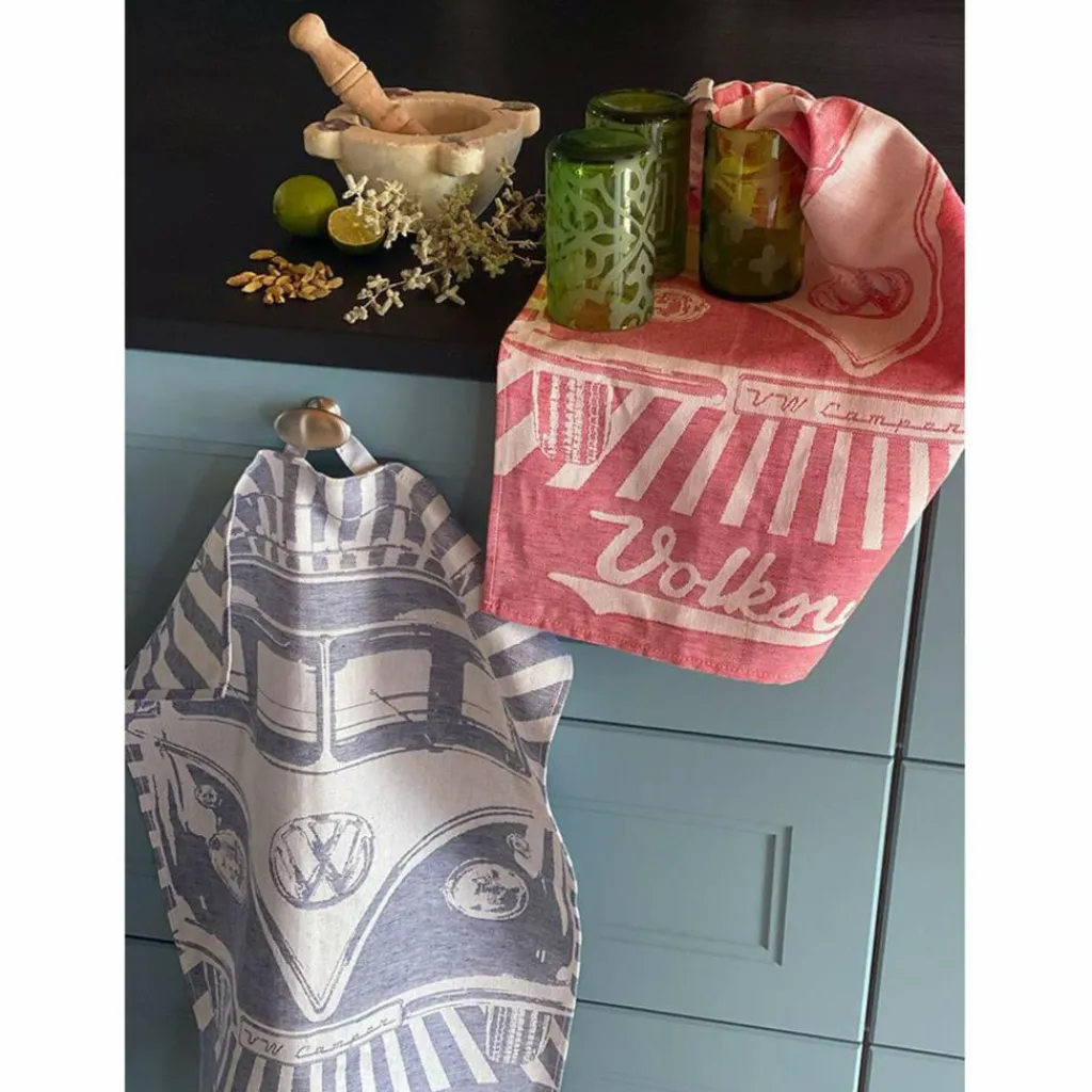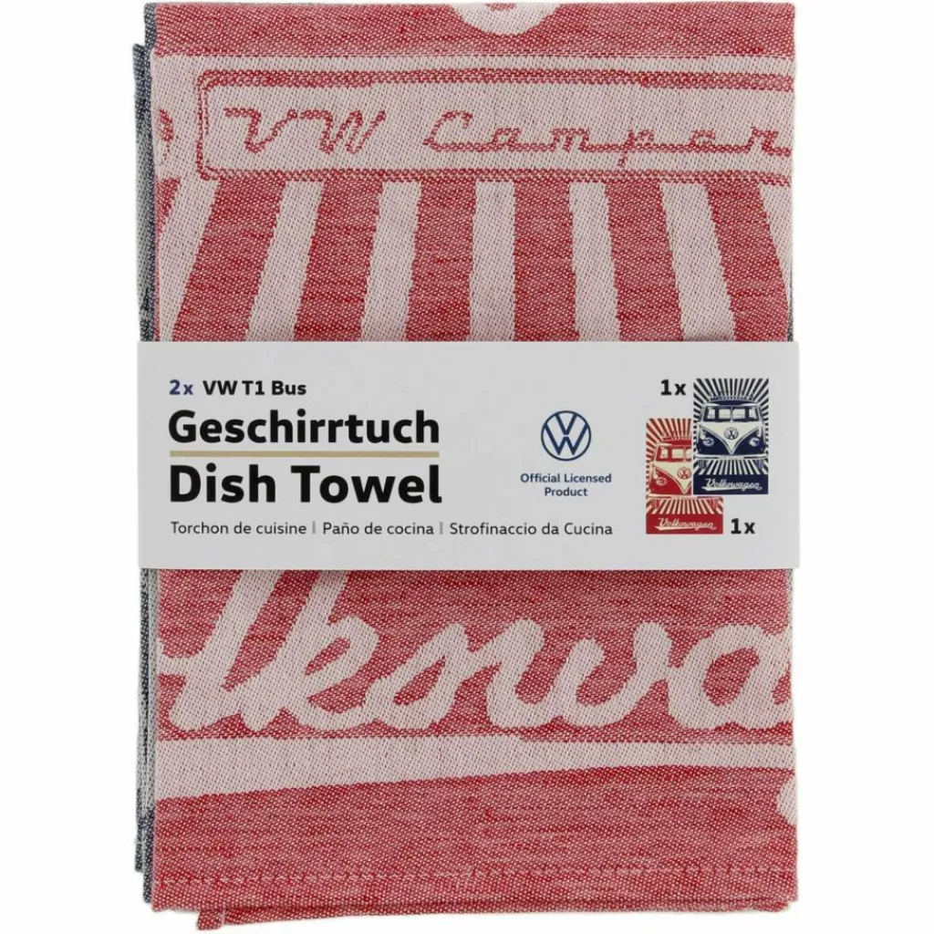 Diese zwei Geschirrhandtücher bringen Nostalgie und Retro-Charme in jede (Bulli-)Küche. Sie sind dank Jacquard-Gewebe stark saugfähig und sind eine schöne Geschenkidee für alle Bulli-Fans.