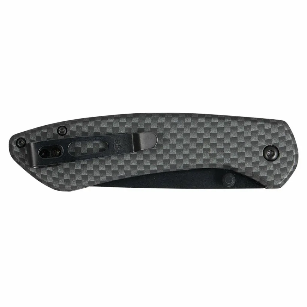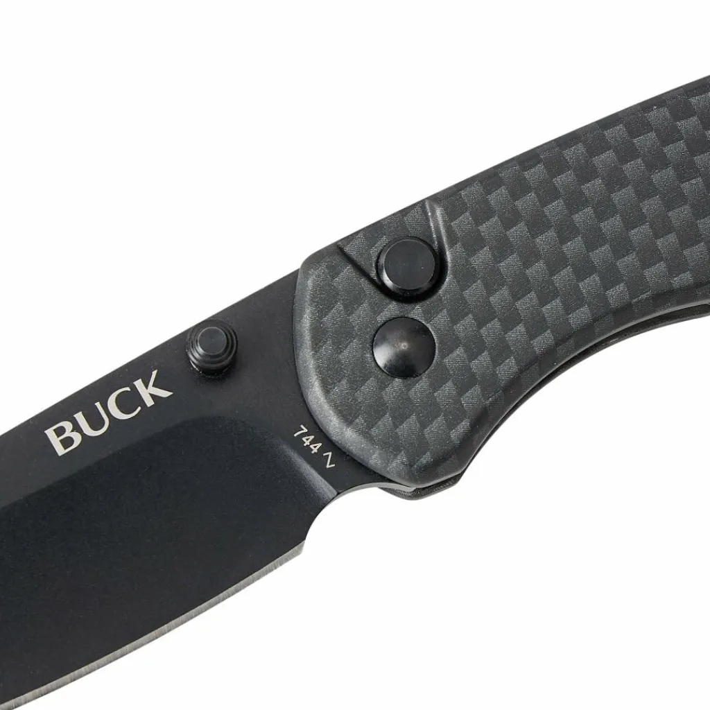 Bucks erstes Messer mit Button-Lock-Arretierung ist ein echter Hingucker. Auch wenn es auf den ersten Blick optisch zurückhaltend erscheint, wird man beim zweiten Hinschauen überrascht sein. Der Edelstahlgriff glänzt in Carbon-Optik und verleiht dem Messer ein modernes Aussehen. Über den Daumenpin kann die Klinge einhändig in die Arbeitsposition gebracht werden, wo sie dank der Button-Lock-Arretierung sicher verriegelt. Durch Drücken auf den eingelassenen Knopf lässt sich die Verriegelung lösen, um das Sovereign mithilfe des Taschenclips in der Hosentasche zu verstauen.