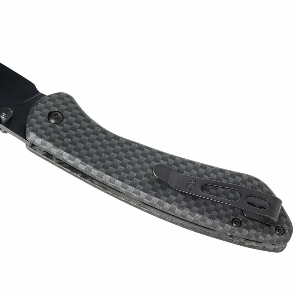 Die schwarz beschichtete Clip-Point-Klinge besteht aus robustem 7CR17MoV-Stahl. Dieser bietet eine gute Balance zwischen Schnitthaltigkeit und Korrosionsbeständigkeit und lässt sich leicht nachschärfen.