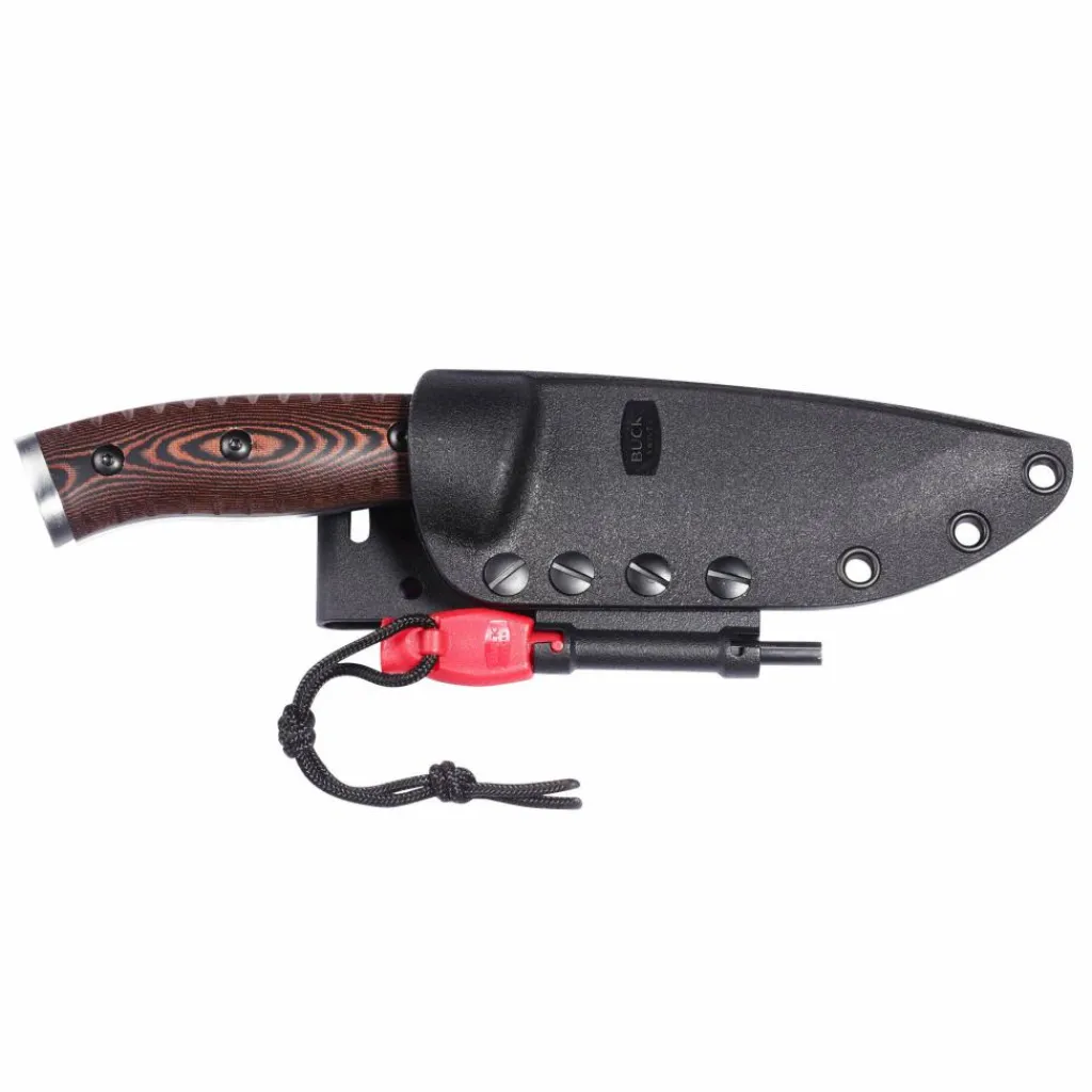 An der Seite der Scheide hat ein Feuerstarter seinen Platz. Der Griff des Starters ist mit einer Signalpfeife ausgerüstet. Zum Funken schlagen nutzt man die ausgeprägt große Schleifkerbe am Ende der Klinge. Die Kerbe fällt deshalb auch entsprechend scharfkantig aus.