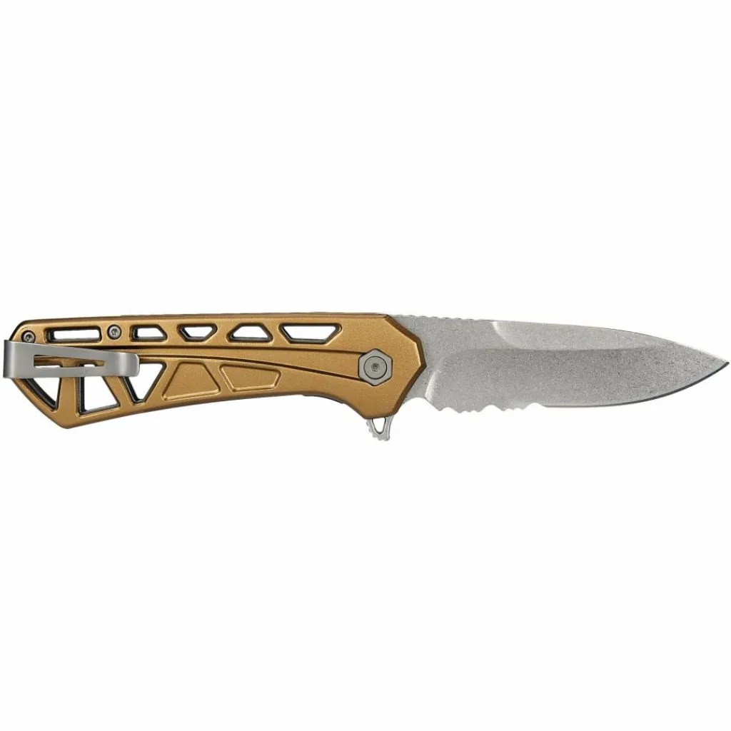 Die Klinge aus 7Cr17-Stahl ist im hinteren Teil mit einem Teilwellenschliff versehen, der dir das Durchtrennen von Schnüren und Seilen erleichtert. Der vordere Bereich ist glatt geschliffen und für klassische Schneidaufgaben ausgelegt. Der kugelgelagerte Flipper hilft dir, die Klinge in Arbeitsposition zu bringen, wo sie dank der Liner-Lock-Verriegelung sicher arretiert. Für ein besseres Handling sorgen der ergonomische Griff und die strukturierte Daumenauflage auf dem Klingenrücken. Der Hosentaschenclip ist verschraubt und kann auf beiden Seiten der Griffschalen montiert werden, was das Messer sowohl für Rechts- als auch für Linkshänder geeignet macht.