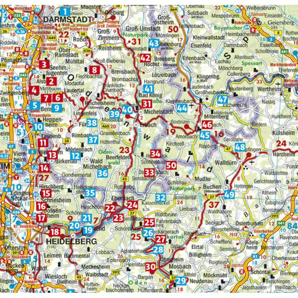 Der Odenwald ist ein Wald voller Geheimnisse, voller Geschichte und Geschichten – von Römern, Riesen und Raubrittern, von weißen Jungfern und zauberkundigen Zwergen. Außerdem ist er ein ge-mütliches Wandergebiet. Die Anstiege sind gering und zwischendurch sorgen gepflegte Gasthäuser für Gaumenfreuden – ein ideales Wanderrevier für Familien mit Kindern also, für Ausflügler und Genießer. Doch auch ambitioniertere Wanderer kommen nicht zu kurz, denn Bernhard Pollmann, ein hervorragender Kenner der Mittelgebirge, stellt neben 46 Tageswanderungen unterschiedlicher Dauer auch vier Weitwanderwege vor: Den E1 im Vorderen Odenwald, den Weitwanderweg durch das Neckartal, den Nibelungenweg sowie den westlichen Limeswanderweg.
