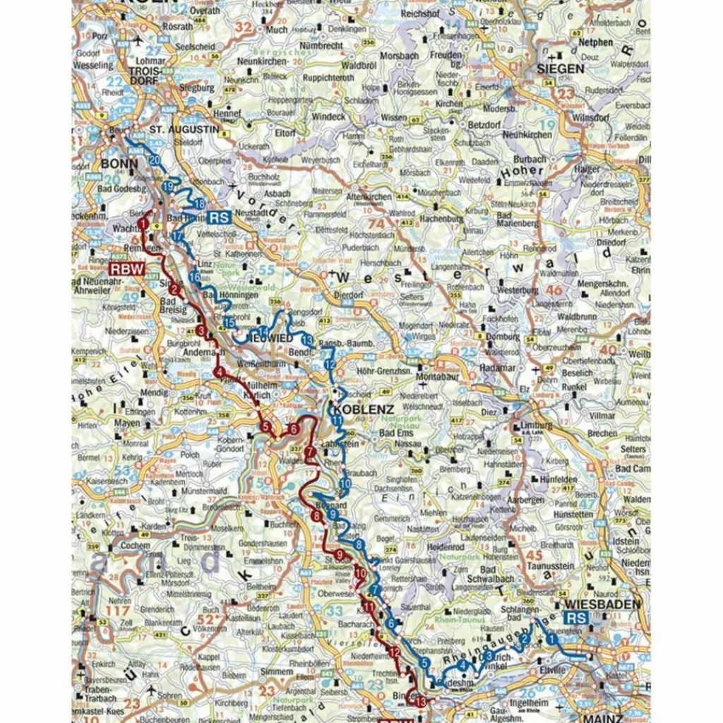Der Rother Wanderführer »Rheinsteig – RheinBurgenWeg« stellt die wichtigsten Weitwanderwege am Mittelrhein vor: Der Rheinsteig, Premiumwanderweg und einer der zwölf »Top Trails of Germany«, verläuft in 20 Etappen und 320 Kilometern auf der rechten Rheinseite von Wiesbaden bis Bonn. Der RheinBurgenWeg, sein Pendant auf der linken Rheinseite, führt in 13 Etappen auf rund 200 Kilometern von Rolandseck nach Bingen. Über 100 Jahre alte Klassiker sind die Rheinhöhenwege: Beidseits des Rheins führen sie von Wiesbaden nach Bonn-Beuel bzw. von Bonn nach Alsheim. Auf herrlichen und abwechslungsreichen Wegen wandert man durch die Rebenmeere von Rheinhessen und Rheingau, durch die bewaldeten Berge von Taunus und Hunsrück, durch das Rheinische Schiefergebirge und den Westerwald ebenso wie durch die Vulkaneifel und die Basaltkegel des Siebengebirges.