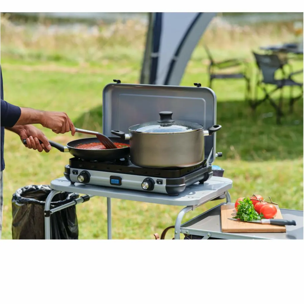 Der Camping Kitchen 2 Maxi ist mit zwei großen Kochflächenausgestattet, die Töpfe und Pfannen bis 28 cm Durchmesser aufnehmen können. Zwei getrennt regelbare Brenner leisten je bis zu 1800 Watt.