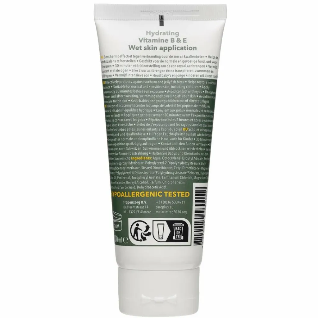 Die Sonnencreme von Care Plus ist wasserfest und schützt mit SPF 50+ bei starker UV-Strahlung. Sie eignet sich für sonnige Tage am Strand, auf dem Wasser und in den Bergen.