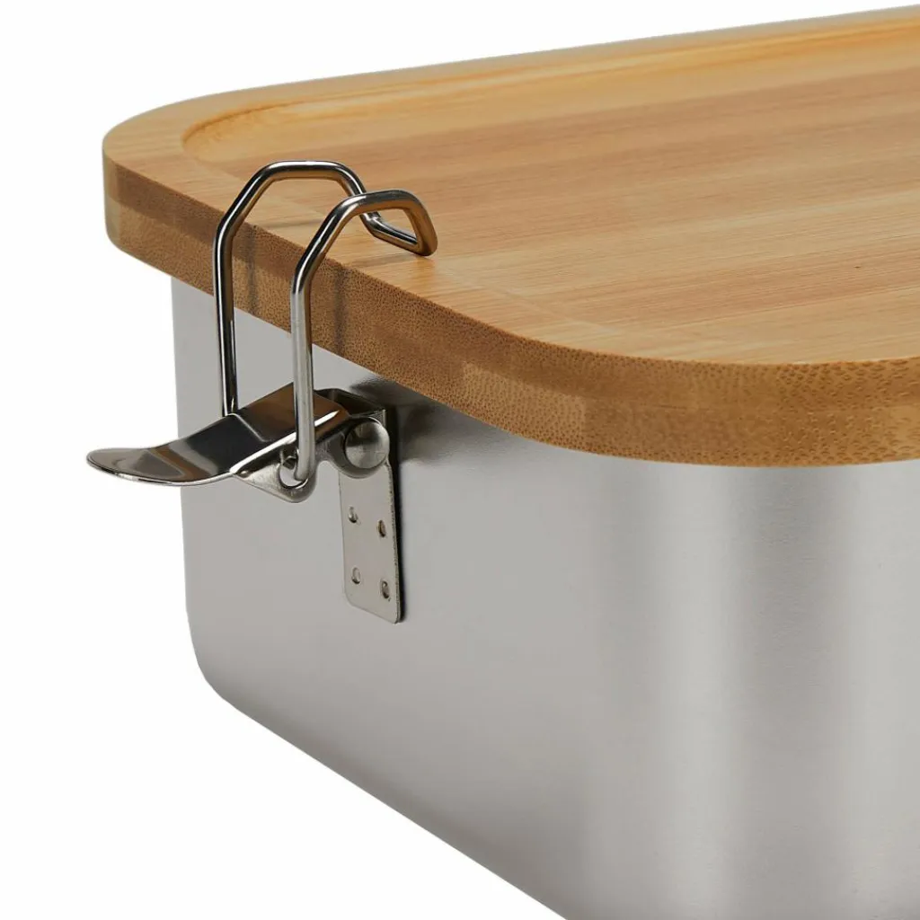 Praktische Dose aus Edelstahl mit Bambusdeckel und zwei Bügelverschlüssen, die den Deckel sicher verschließen.