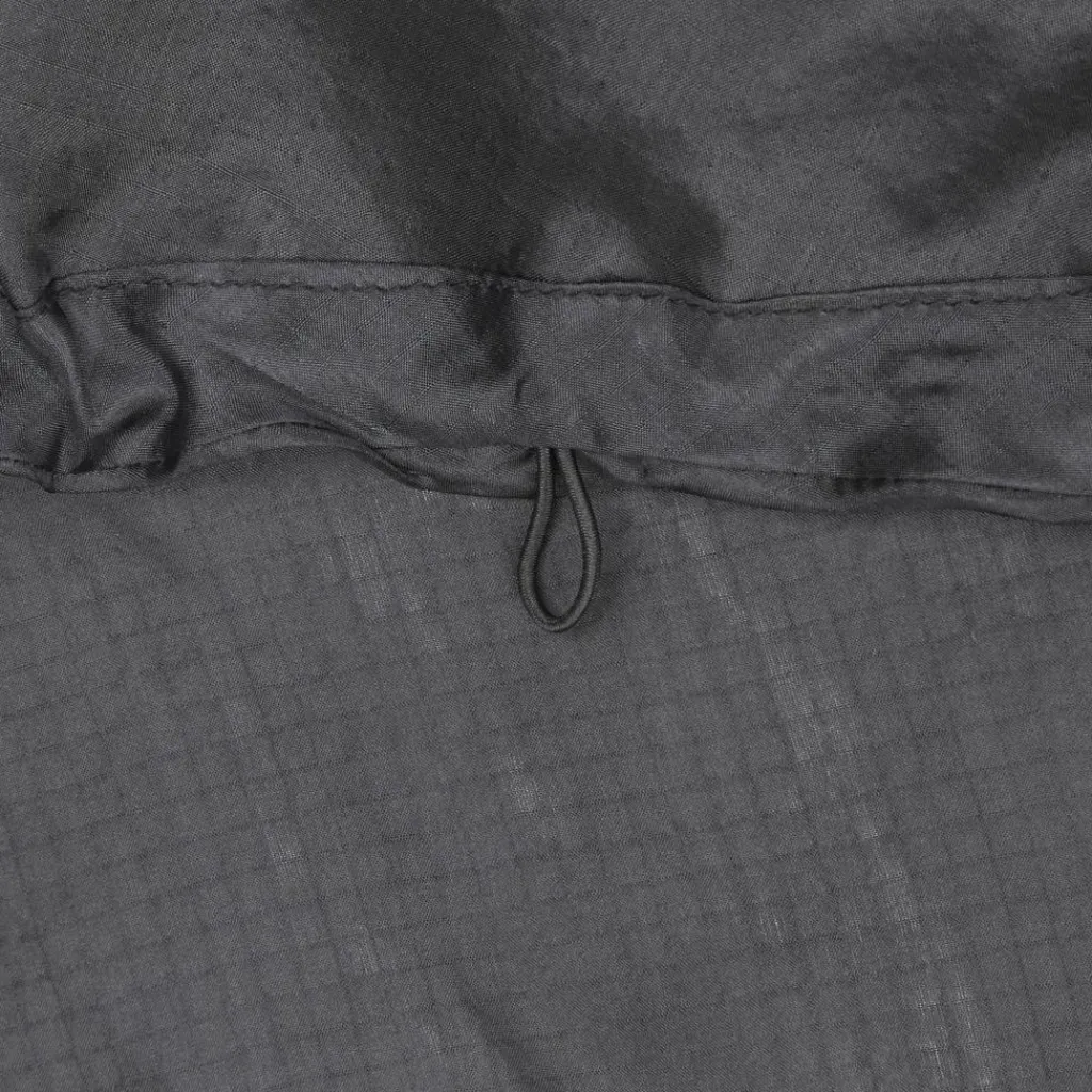 Die Kapuze lässt sich mit einem elastischen Kordelzug enger stellen. Um das Inlett strapazierfähiger und reißfester zu machen, sind verstärkte Seidenfäden eingearbeitet, die ein typisches Ripstop-Muster bilden. Der Packbeutel ist auf Brusthöhe angenäht und geht dadurch nicht verloren.