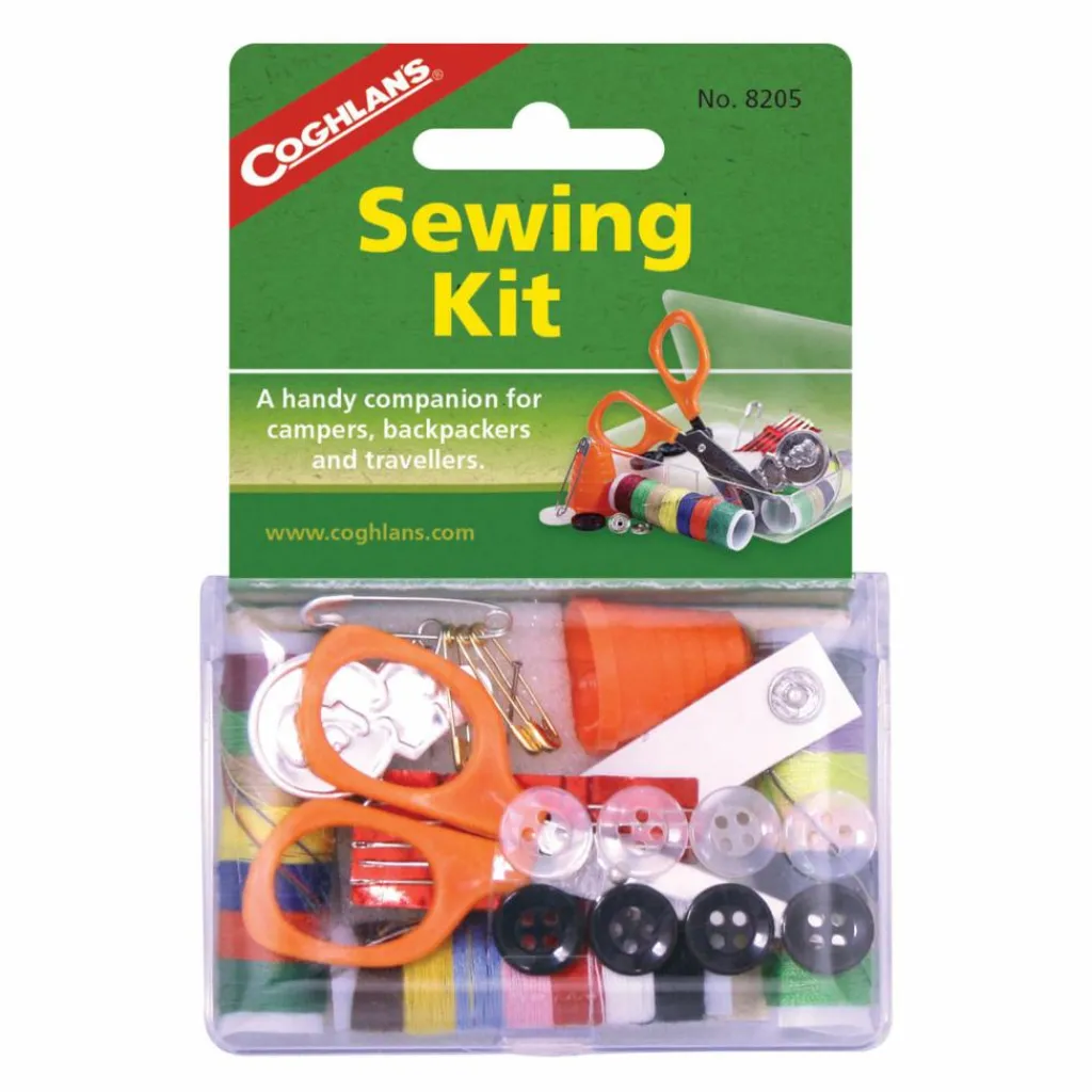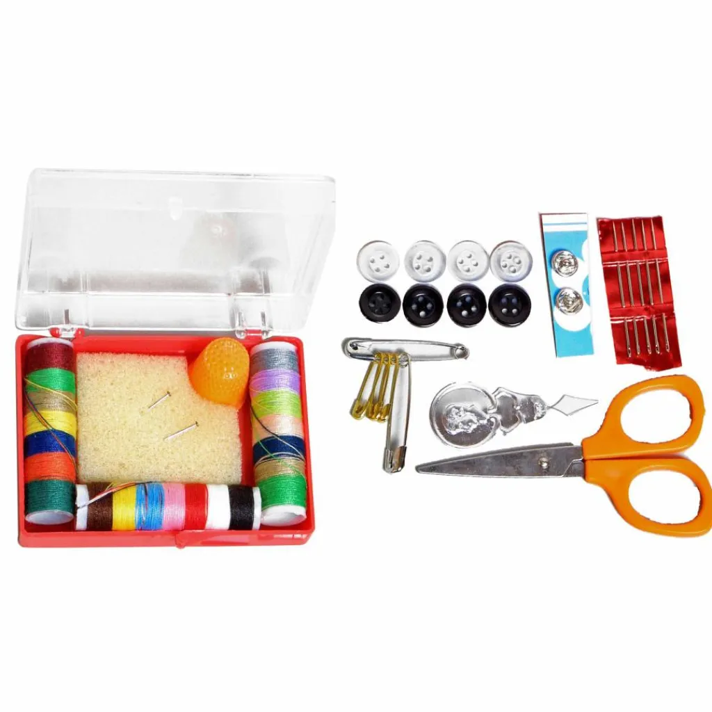 Das Nähset eignet sich für alle kleinen Reparaturen unterwegs. Es enthält u. a. Garn zum Flicken von Rissen, Knöpfe für Hemd und Hose sowie Druckknöpfe.