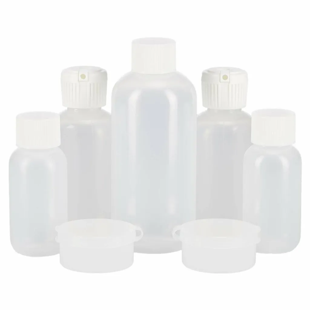 Universelles Set aus verschieden großen Kunststoffflaschen und Dosen für Lebensmittel, Medizin, Kontaktlinsenflüssigkeit etc. Die Behälter sind Handgepäckgeeignet.