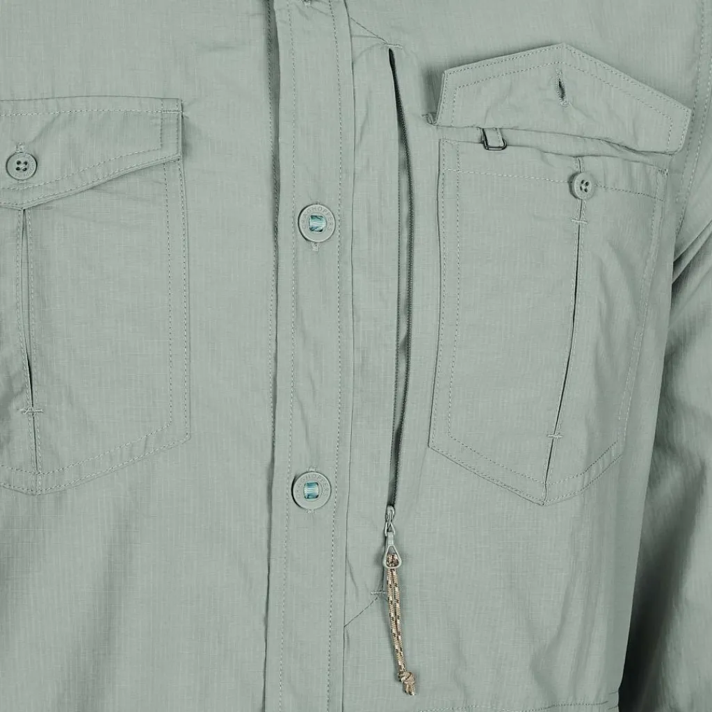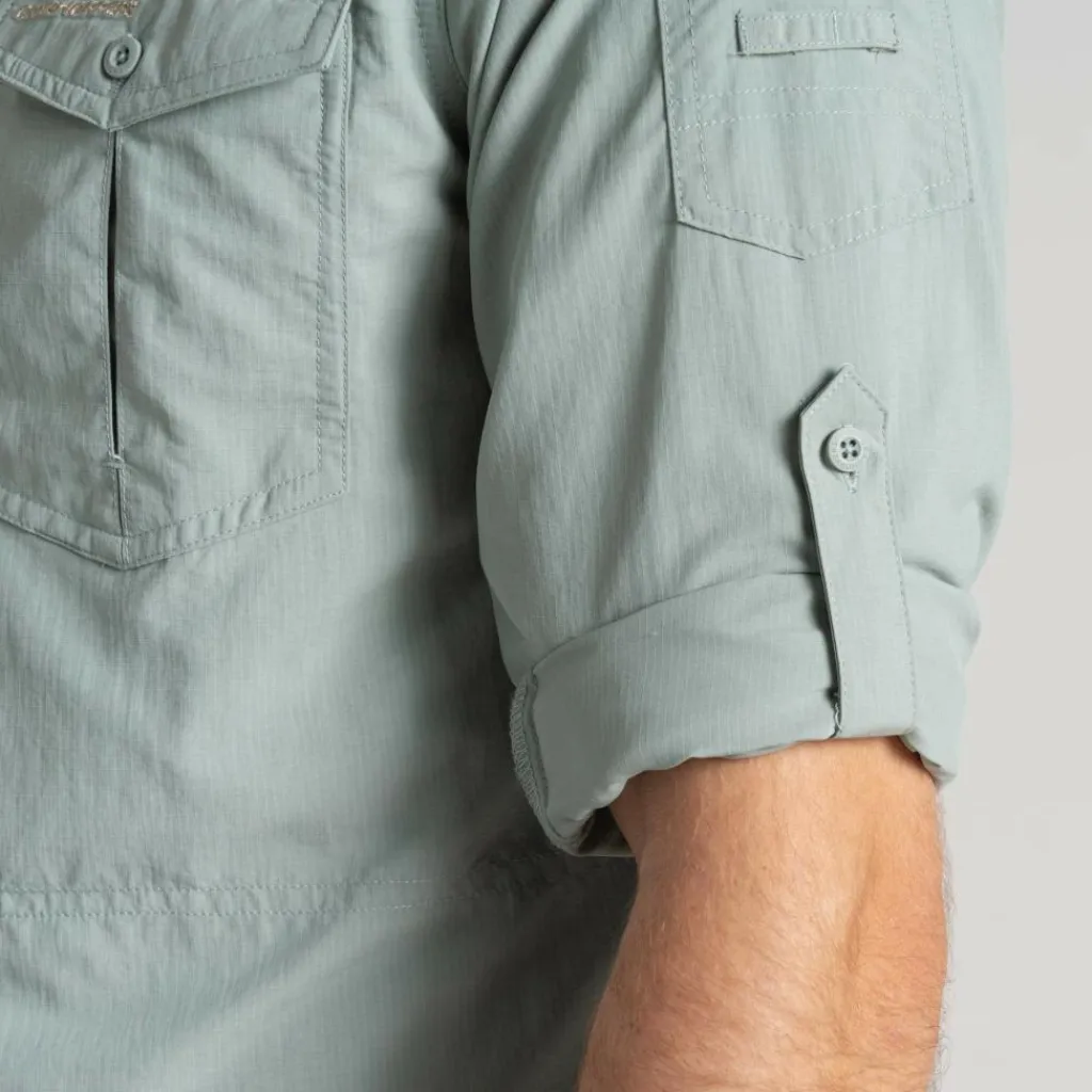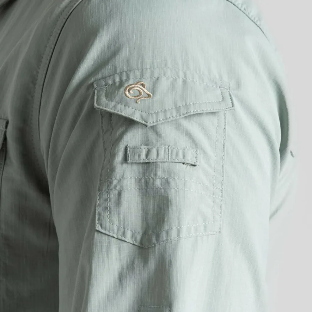 Die Ärmel des Langarmhemds lassen sich ganz einfach zum Kurzarm aufrollen und mit Lasche und Knopf fixieren. Der klassische Kragen kann zum Schutz vor der Sonne doppelt ausgeklappt werden. Für Stauraum sorgen einige Taschen. Eine lässt sich sogar durch einen kleinen Karabinerhaken verschließen.