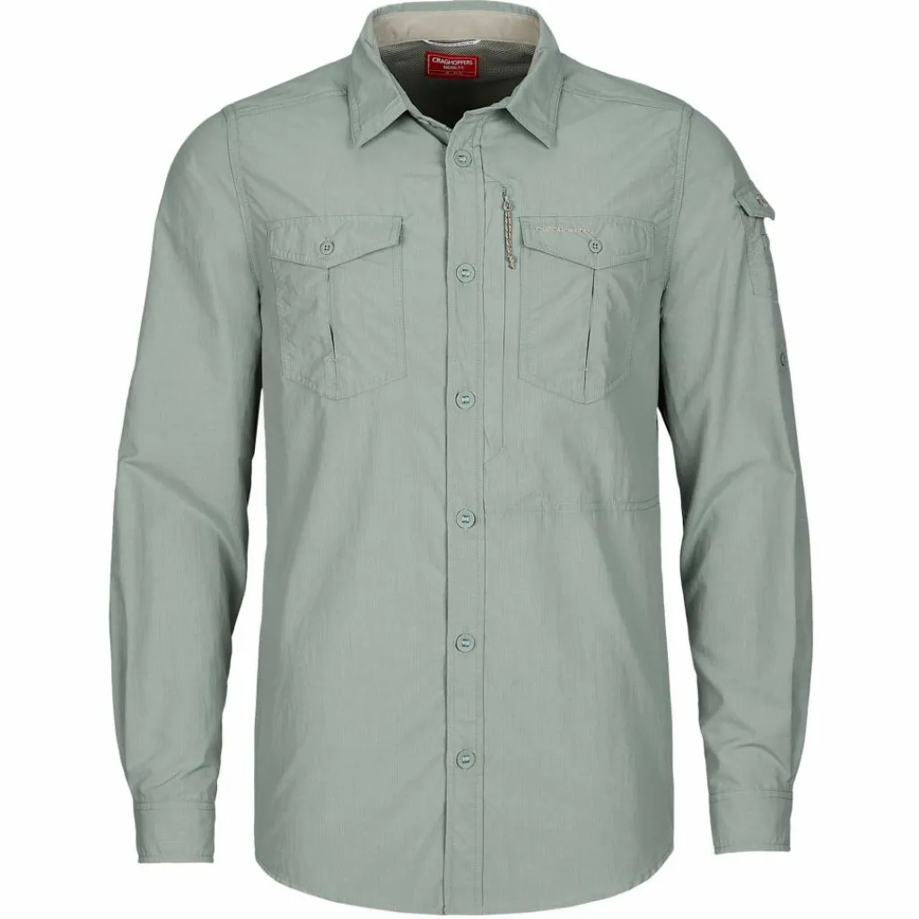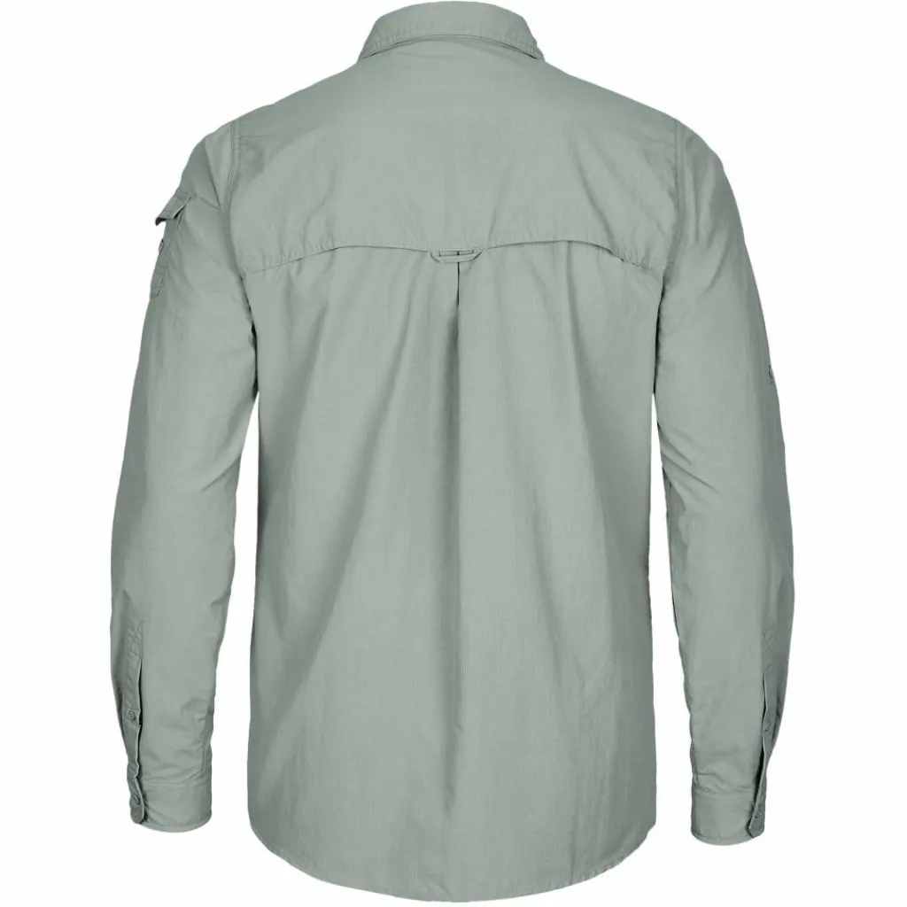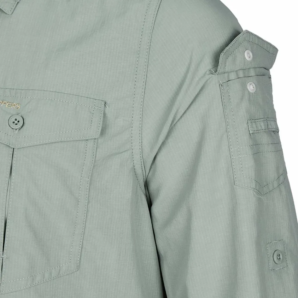 Die Ärmel des Langarmhemds lassen sich ganz einfach zum Kurzarm aufrollen und mit Lasche und Knopf fixieren. Der klassische Kragen kann zum Schutz vor der Sonne doppelt ausgeklappt werden. Für Stauraum sorgen einige Taschen. Eine lässt sich sogar durch einen kleinen Karabinerhaken verschließen.