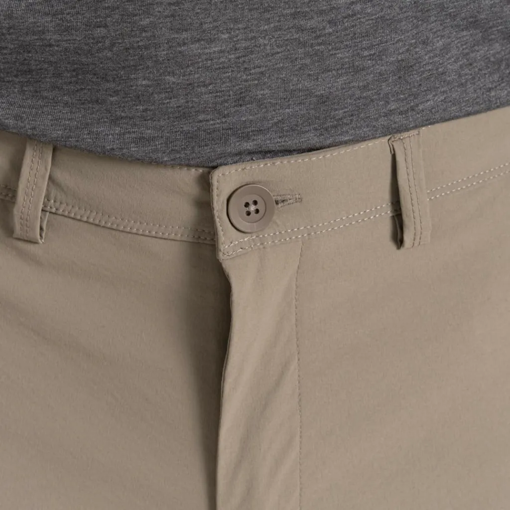 Das Material der bequemen Reisehose besteht aus zum Teil recyceltem Polyamid. Was das Gewebe nicht nur nachhaltiger, sondern auch robuster macht. Durch die Zugabe von Elasthan kommt noch eine gute Portion Dehnbarkeit hinzu, welche bei Wanderungen und Erkundungen von Nutzen ist. Das Material verfügt über ein gutes Feuchtigkeitsmanagement, dass dir in wärmeren Gefilden hilfreich zur Seite steht.