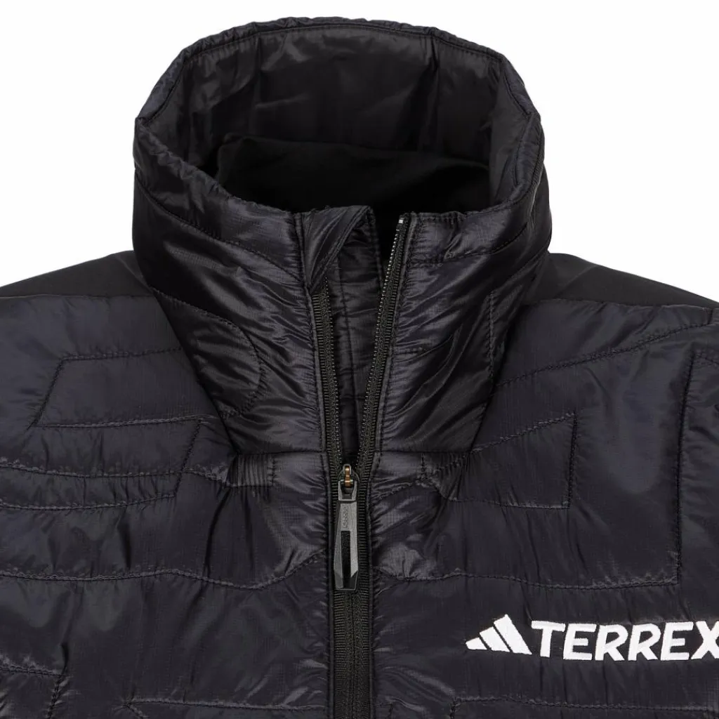 Die Vorderseite ist mit einer dünnen, hochwertigen Synthetik-Füllung (Primaloft Gold) versehen, die die empfindlichsten Körperregionen schön warm hält und unempfindlich gegenüber Feuchtigkeit ist. Das Pertex Quantum-Außenmaterial hat einen weichen Griff, ist angenehm leicht und dünn, dennoch aber sehr strapazierfähig. Außerdem schützt das windabweisende Material vor kaltem (Fahrt-)Wind. Die dezente Terrex-Steppung hält auf stylishe Art und Weise das Füllmaterial dort, wo es hingehört.