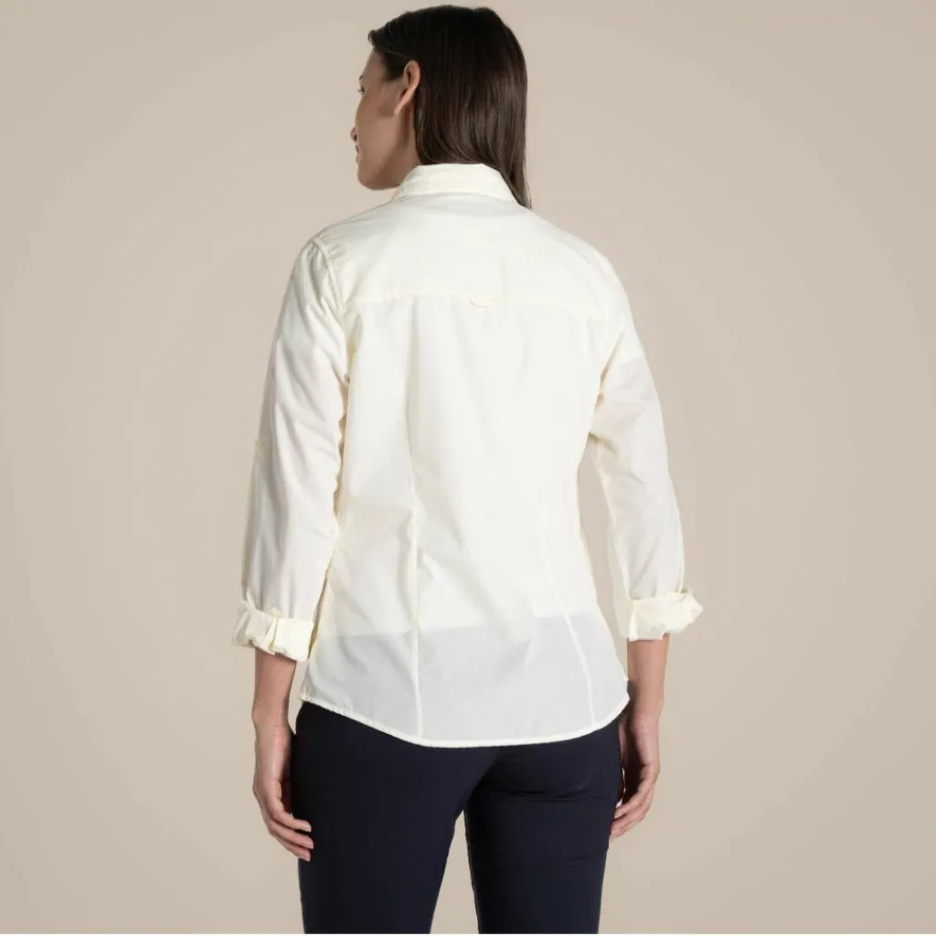 Die Outdoor Bluse hat aber noch eine weitere Besonderheit. Ihre Fasern sind so dicht gewoben, dass es Mücken und anderen surrenden Nervensägen erschwert wird, dich zu stechen. Um Deinem Nacken ein wenig Schutz vor der Sonne zu gönnen, lässt sich der Kragen umschlagen. Benötigst du ein wenig Abkühlung, kannst du die Ärmel einfach aufrollen und mithilfe eines Knopfs und einer Lasche fixieren. Wertsachen finden ihren Platz in der gut versteckten, da nahtfeinen, seitlichen RV-Tasche. Zusätzlich steht dir noch eine Brusttaschen zur Verfügung.