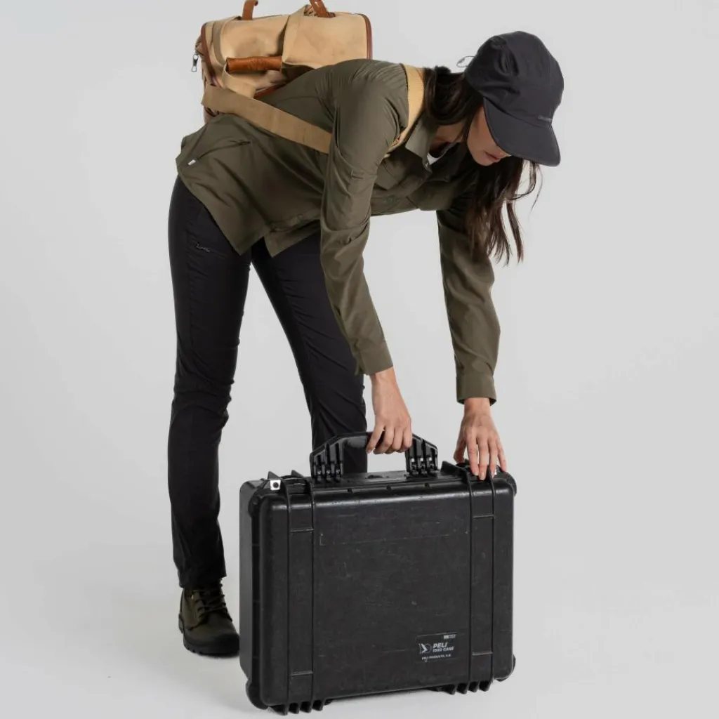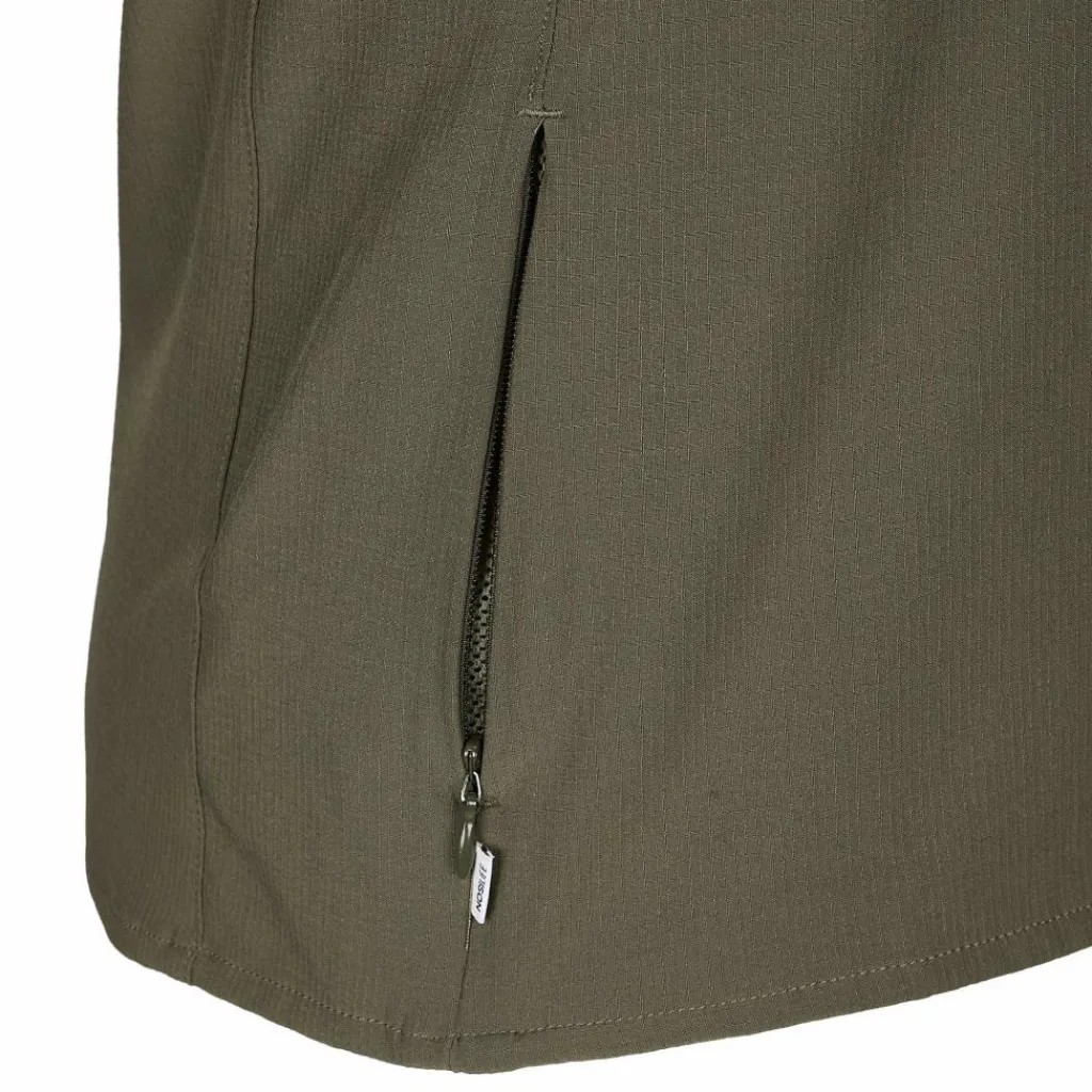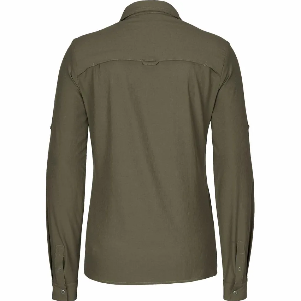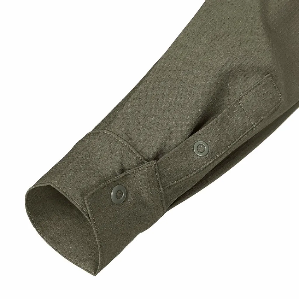 Die Bluse setzt auf leichte Handhabung. Ihr Material ist pflegeleicht und knitterarm, die durchgehende Knopfleiste und die beiden Brusttaschen sind mit Druckknöpfen versehen. Aus den langen Armen wird mit wenigen Handgriffen eine Kurzarm-Variante. Auch deine Sonnenbrille darf ein wenig Luxus genießen. Am Ärmel gibt es eine Halterung und im unteren Teil der Knopfleiste versteckt sich ein Brillenputztuch. Ganz schön praktisch.