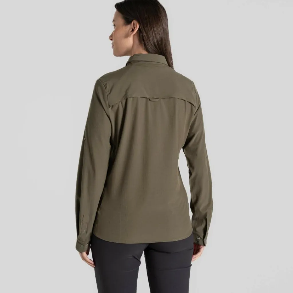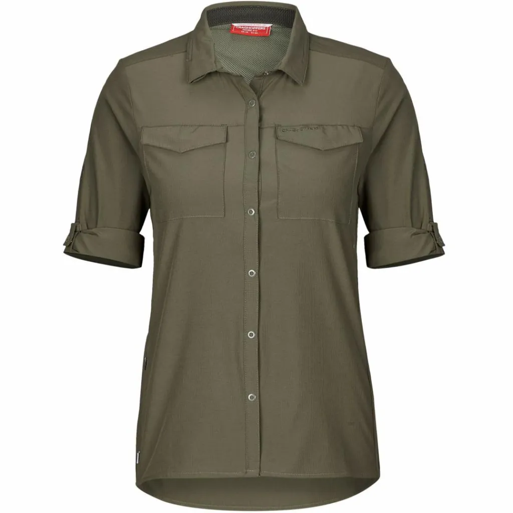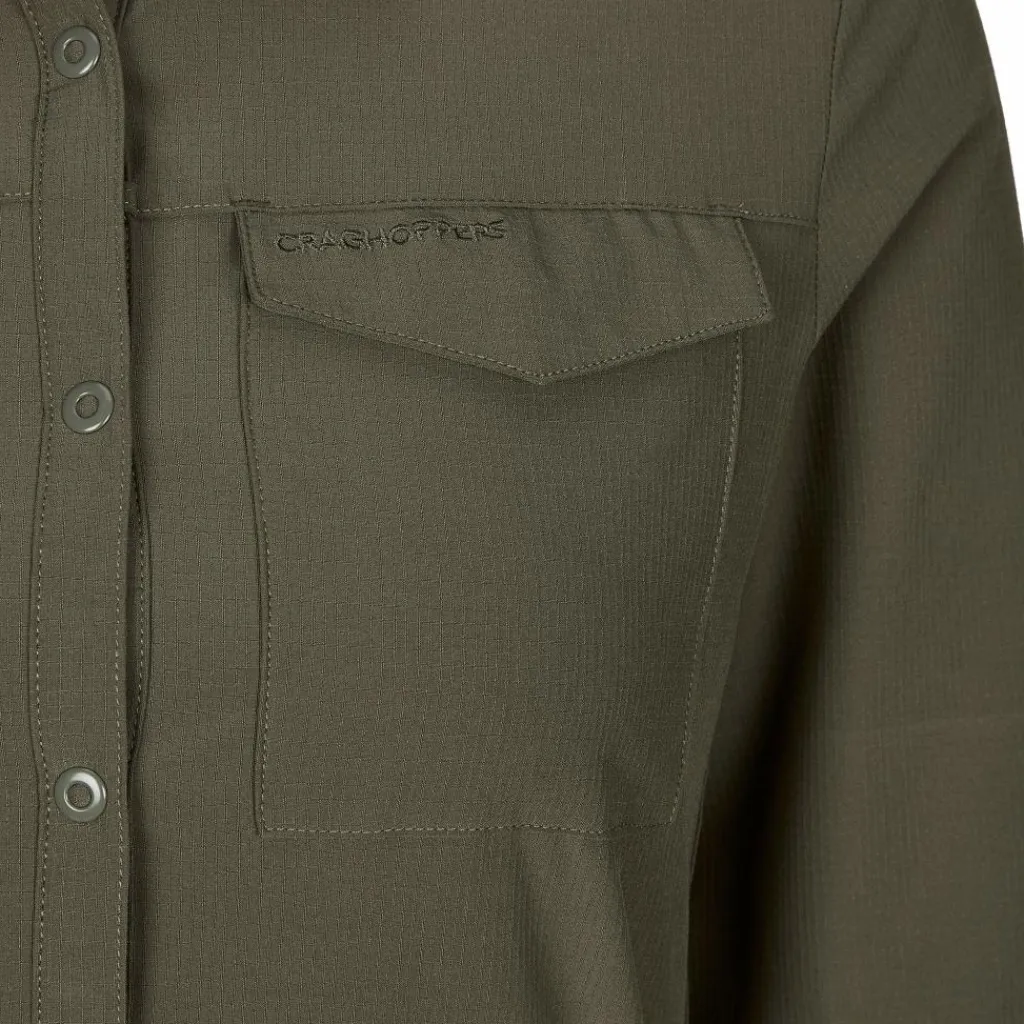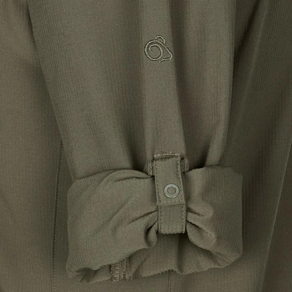 Die Bluse setzt auf leichte Handhabung. Ihr Material ist pflegeleicht und knitterarm, die durchgehende Knopfleiste und die beiden Brusttaschen sind mit Druckknöpfen versehen. Aus den langen Armen wird mit wenigen Handgriffen eine Kurzarm-Variante. Auch deine Sonnenbrille darf ein wenig Luxus genießen. Am Ärmel gibt es eine Halterung und im unteren Teil der Knopfleiste versteckt sich ein Brillenputztuch. Ganz schön praktisch.