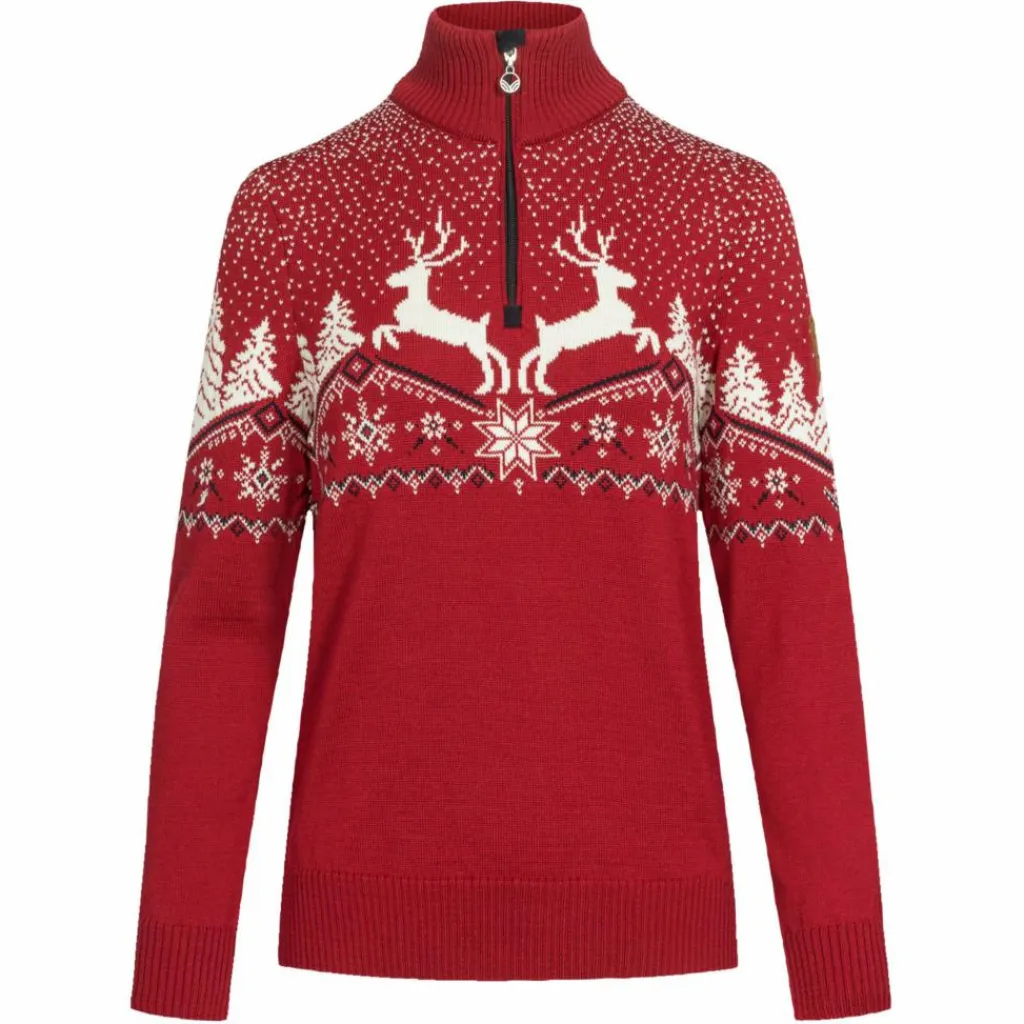 Mit seinem wirklich tollen Design passt der Sweater ideal in die Weihnachtszeit. Die beiden Rentiere vor der winterlichen Kulisse mit leichtem Schneegestöber versprühen die ideale Stimmung und passen perfekt in die kalten Monate. Auch norwegische Tradition ist auf dem Dale Sweater zu finden in Form der traditionellen achblättrigen Rose, die im Zentrum des Pullovers ihren Platz gefunden hat.