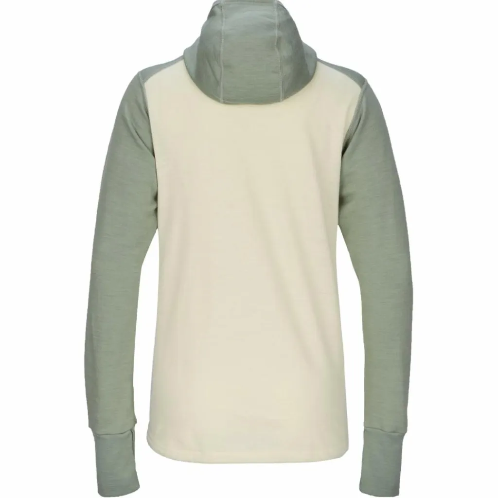 Das Außenmaterial der Jacke besteht aus einem Mix aus Merinowolle und Polyamid. Durch die Kunstfaser ist das Gewebe widerstandsfähiger, was beim Tragen eines Rucksacks von Vorteil ist. Zudem wurde die Außenseite mit Aquaduct behandelt. Aquaduct ist eine stark feuchtigkeitsleitende Ausrüstung, die eine ähnliche Wirkung wie ein absorbierender Docht hat. Dadurch kann entstehende Körperfeuchtigkeit noch schneller nach außen transportiert werden.
