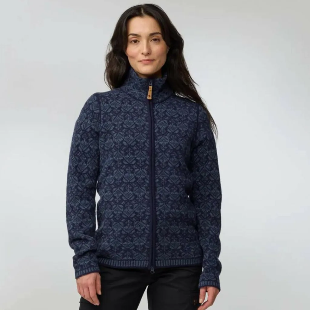 Durch die doppellagige Webart des Jaquard-Strickmusters werden bei diesem Cardigan die guten Isolationseigenschaften der Lammwolle noch einmal verstärkt. Und durch den hohen Stehkragen ist auch dein Hals optimal vor Zugluft und unangenehmer Kälte geschützt. Abgerundet wird das Ganze durch den schlichten Schnitt und das skandinavisch-folkloristische Muster – perfekt für winterliche Waldspaziergänge und gemütliche Hüttenabende vor dem Kamin.