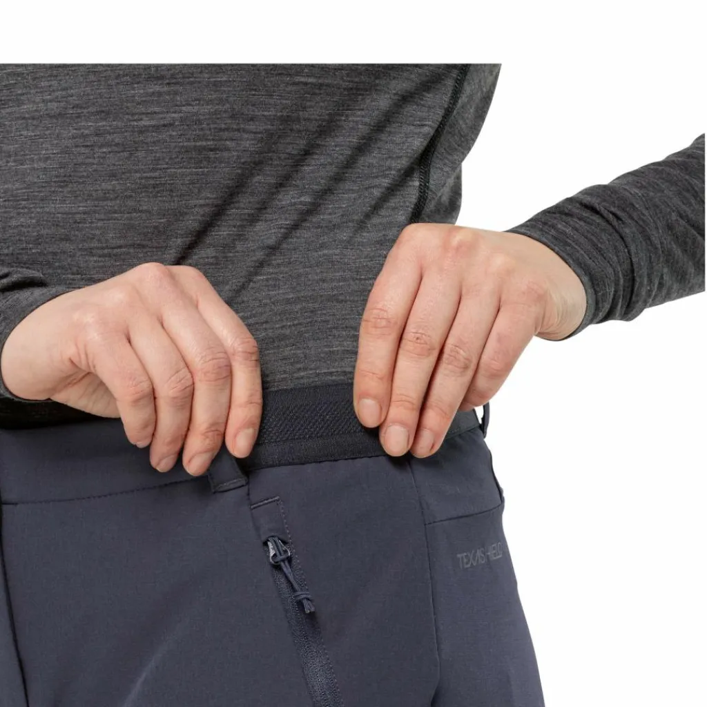 Ihr Kunstfaser-Material ist mit einem guten Feuchtigkeitsmanagement ausgestattet. Wenn also bei anstrengenden Passagen der Schweiß fließt, wird er nach außen geleite, wo er verdunstet. Durch das schnelltrocknende und atmungsaktive Gewebe herrscht somit ein angenehmes Trageklima. Falls du bei leichtem Regen unterwegs bist, ist das für die wasser- und windabweisende Softshellhose kein Problem.