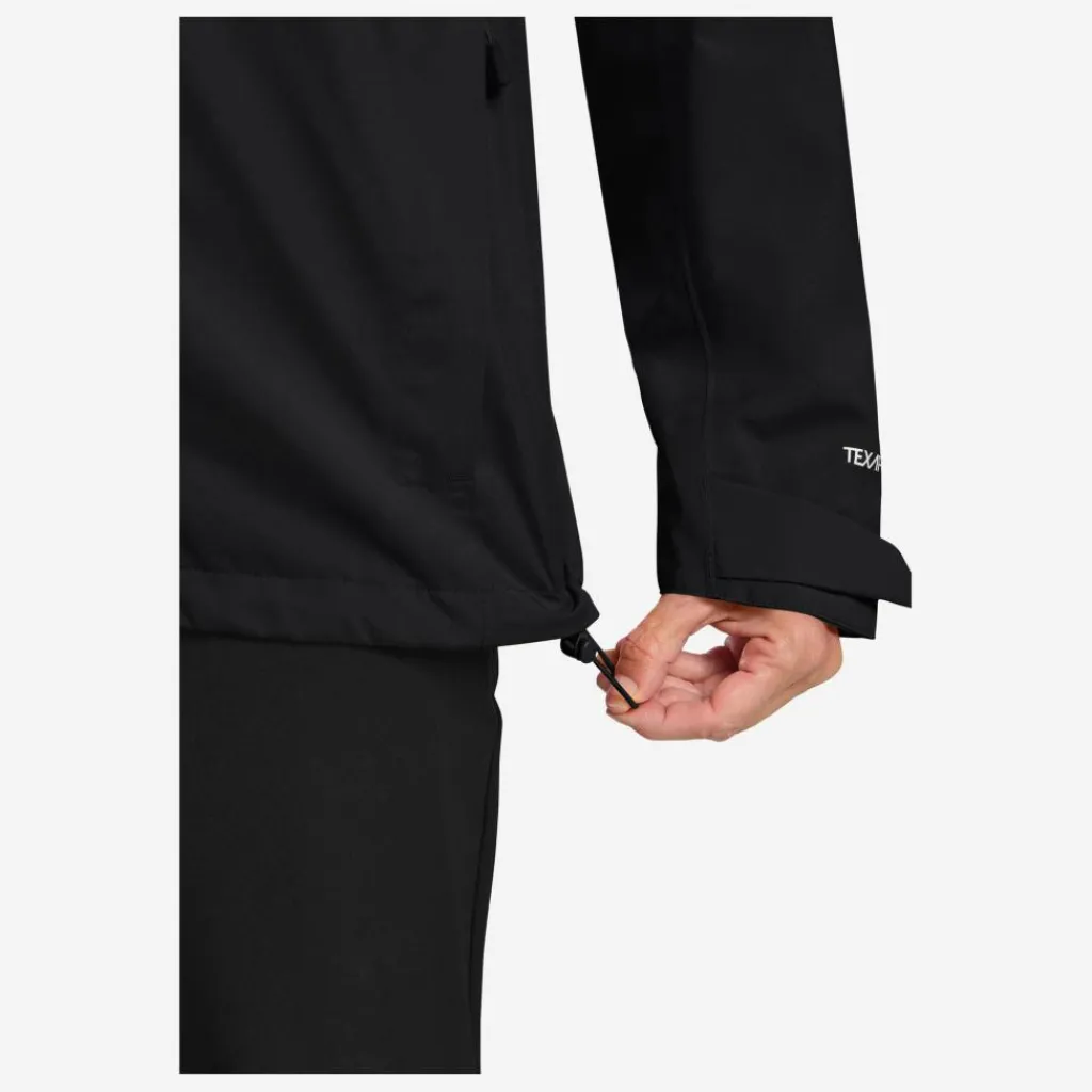 Die Regenjacke besteht aus dem wetterfesten Texapore Ecosphere Pro Material, das vollständig recycelt ist. Es hält dauerhaft Wind und Nässe draußen und ist zugleich atmungsaktiv – ideal für bewegungsintensive Aktivitäten bei unbeständigen Bedingungen. Die Kapuze ist fest integriert und lässt sich individuell anpassen. Über den Kordelzug im Saum und die verstellbaren Ärmelbündchen kannst du den Sitz zusätzlich regulieren.