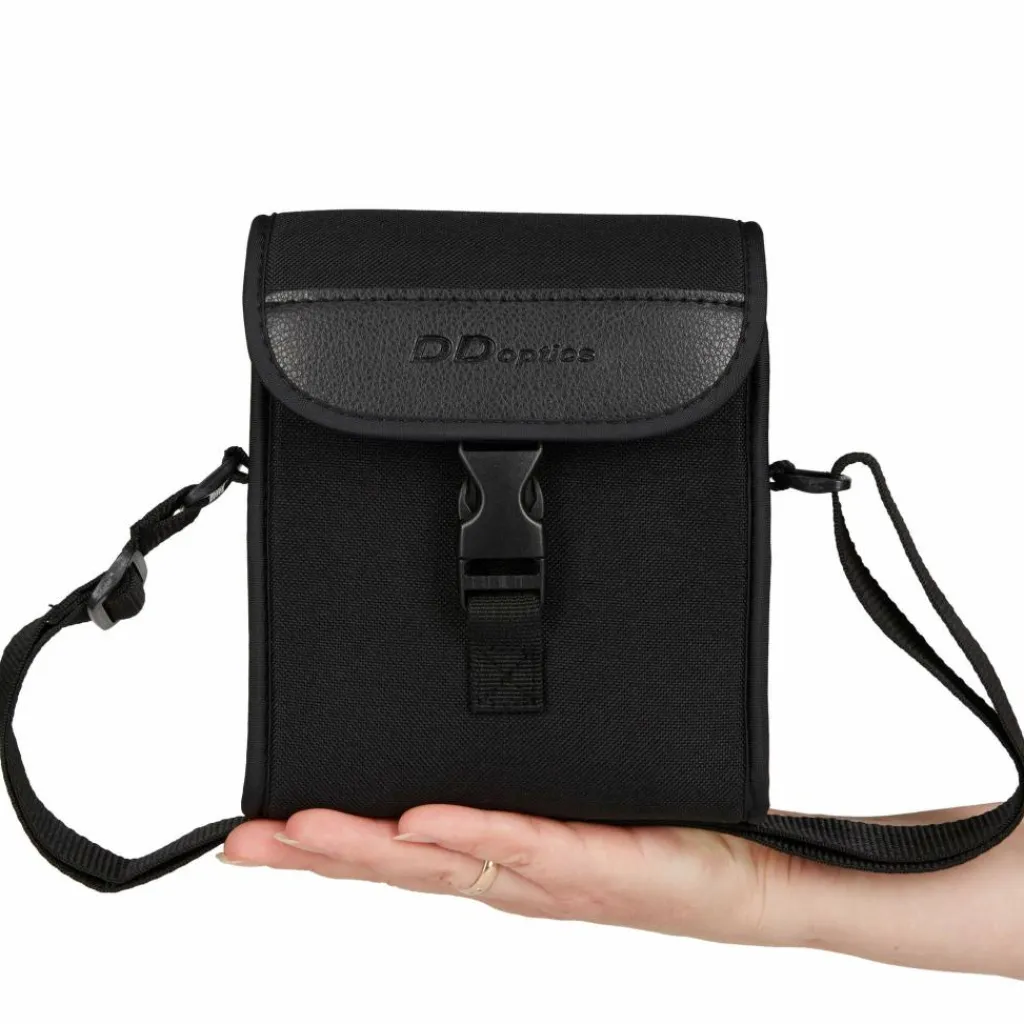 Trotz der Größe ist das Fernglas kompakt und findet selbst in einer Jackentasche einen Platz. Das umfangreiche Zubehör hält einen Neoprengurt und eine gepolsterte Transporttasche für dich bereit. Sie kann wahlweise mit dem Gurt um die Schulter gehängt oder mit der Gürtelschlaufe am Rucksack oder der Hose befestigt werden.