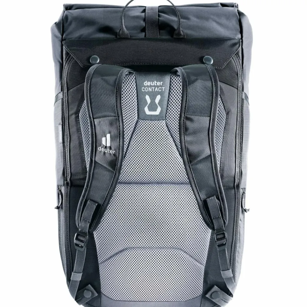 Dank einzigartigem Klappmechanismus wird aus praktischer Hinterradtasche im Handumdrehen ein komfortabler Rucksack. Die mit Druckknöpfen fixierbare Rückenplatte lässt sich mittig nach oben oder unten klappen und legt so entweder die BagFix-Halterung zur Fixierung am Gepäckträger oder die ergonomischen Schulterträger zum Tragen frei. Der Roll-Top-Zugang mit Schnalle, die universelle Befestigungsmöglichkeit der Deckelkonstruktion und weitere Organisationseinheiten ermöglichen einen schnellen Zugriff und praktische Verstaumöglichkeiten. Der leichte, gepolsterte Rücken mit luftigem Bezug sorgt für einen angenehmen Sitz und gleichmäßige Lastverteilung. Die ergonomisch geschnittenen S-förmigen Schulterträger sorgen außerdem für guten Tragekomfort.
