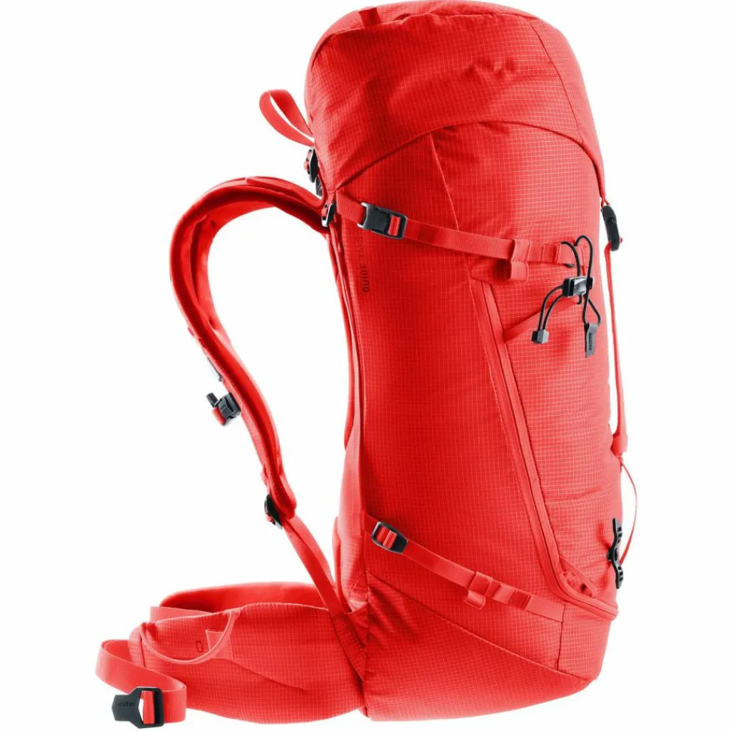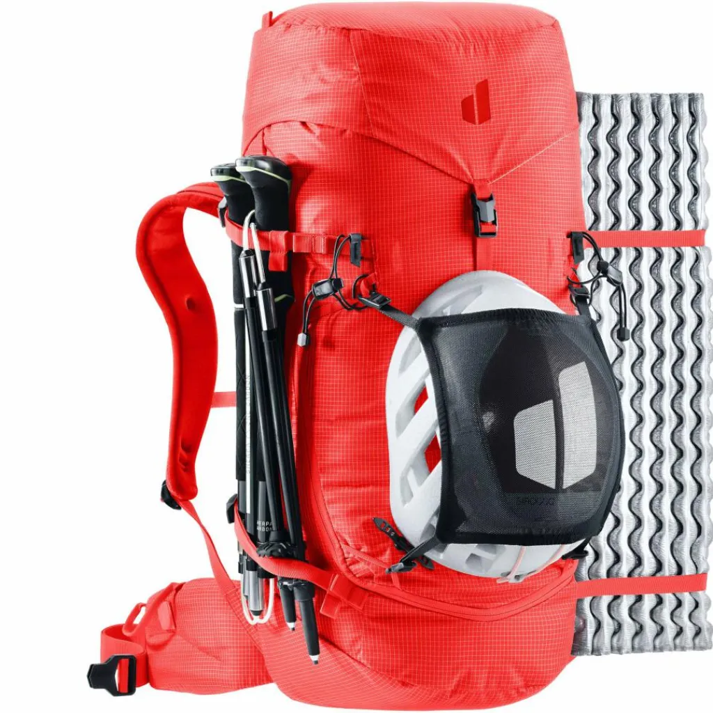 Weil Tragekomfort auch in der Vertikalen nicht zu kurz kommen darf, ist der Guide 34+6 mit Deuters Alpine Tragesystem ausgestattet. Ein gepolsterter Kontaktrücken und die schmale Form halten den Schwerpunkt des Rucksacks nah an deinem Körper, während geschwungene Schultergurte dir maximale Bewegungsfreiheit beim Klettern geben. Beim Steigen sorgt eine ergonomische Rückenplatte mit Federstahlrahmen für Packstabilität und effiziente Lastenübertragung.