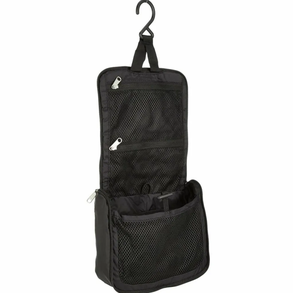 Am Urlaubsort angekommen, kannst du die Kulturtasche platzsparend an dem ausklappbaren Haken aufhängen. Die Innenfächer bestehen aus Netzstoff. Das spart nicht nur Gewicht, sondern gibt auch die Sicht auf den Inhalt frei.